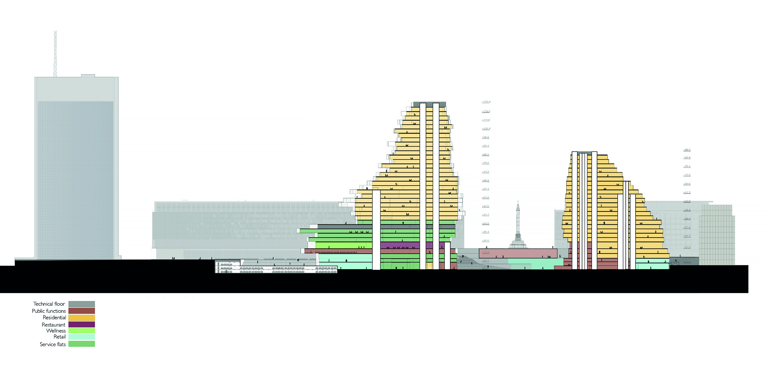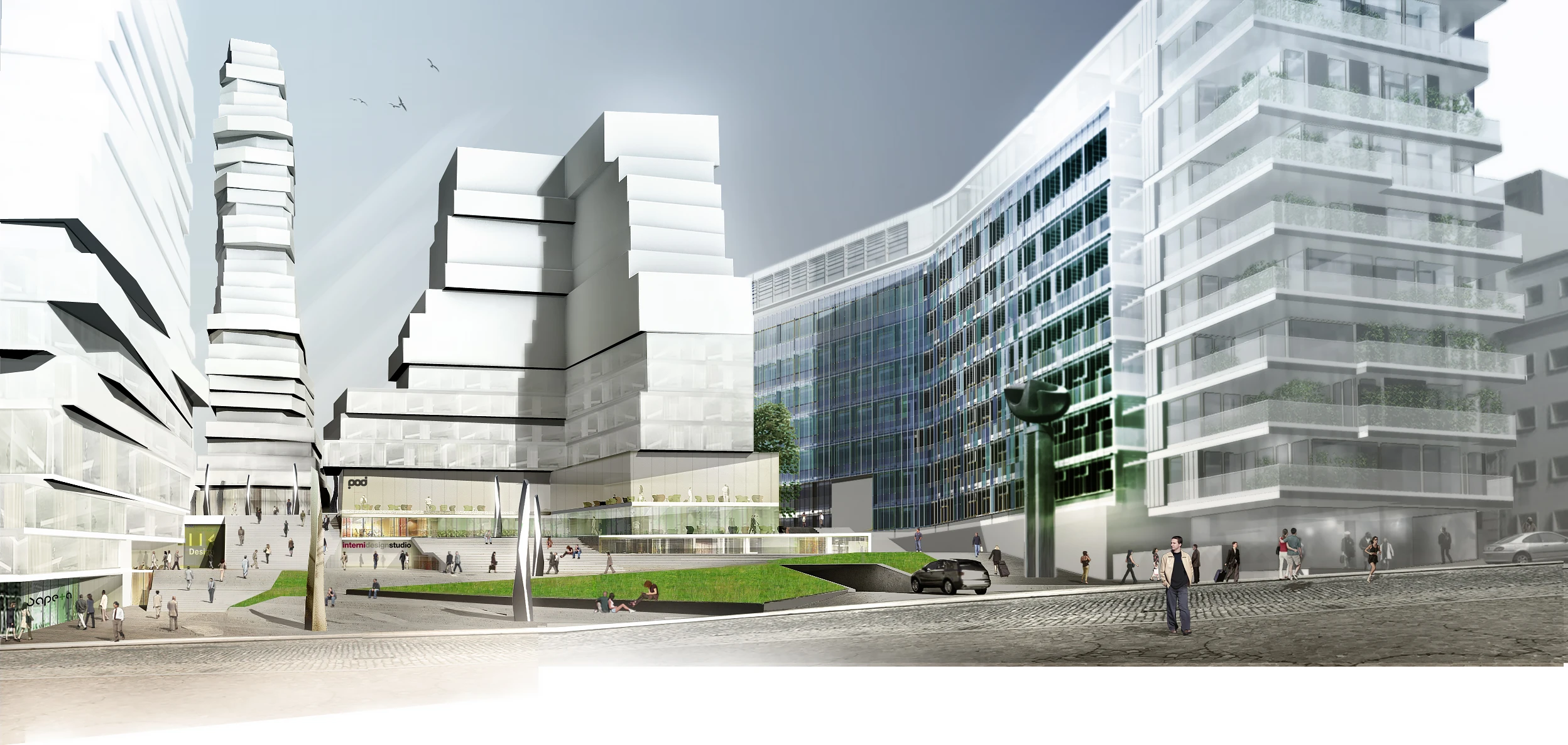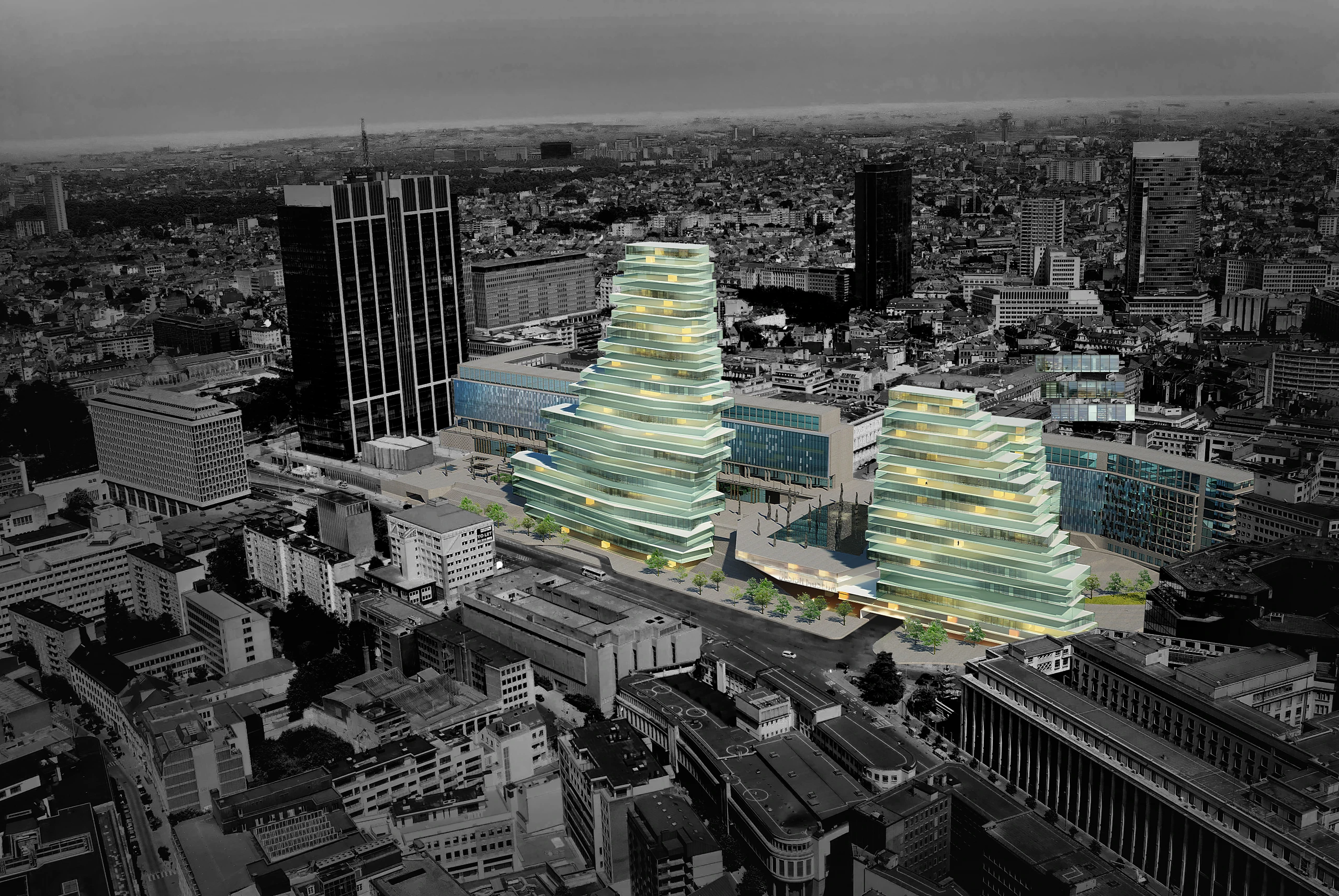 The redevelopment project, BELAIR, aims to provide a better connection between the upper town and the lower town. It includes the renovation of a number of buildings in and around the Pachecolaan and the Koningsstraat and of the recently renovated Finance Tower just behind it. The joint plan also envisages the construction of new buildings on the site, including two symbolic buildings in the form of triangles with “offset” floors that look roughly stacked on top of each other.
