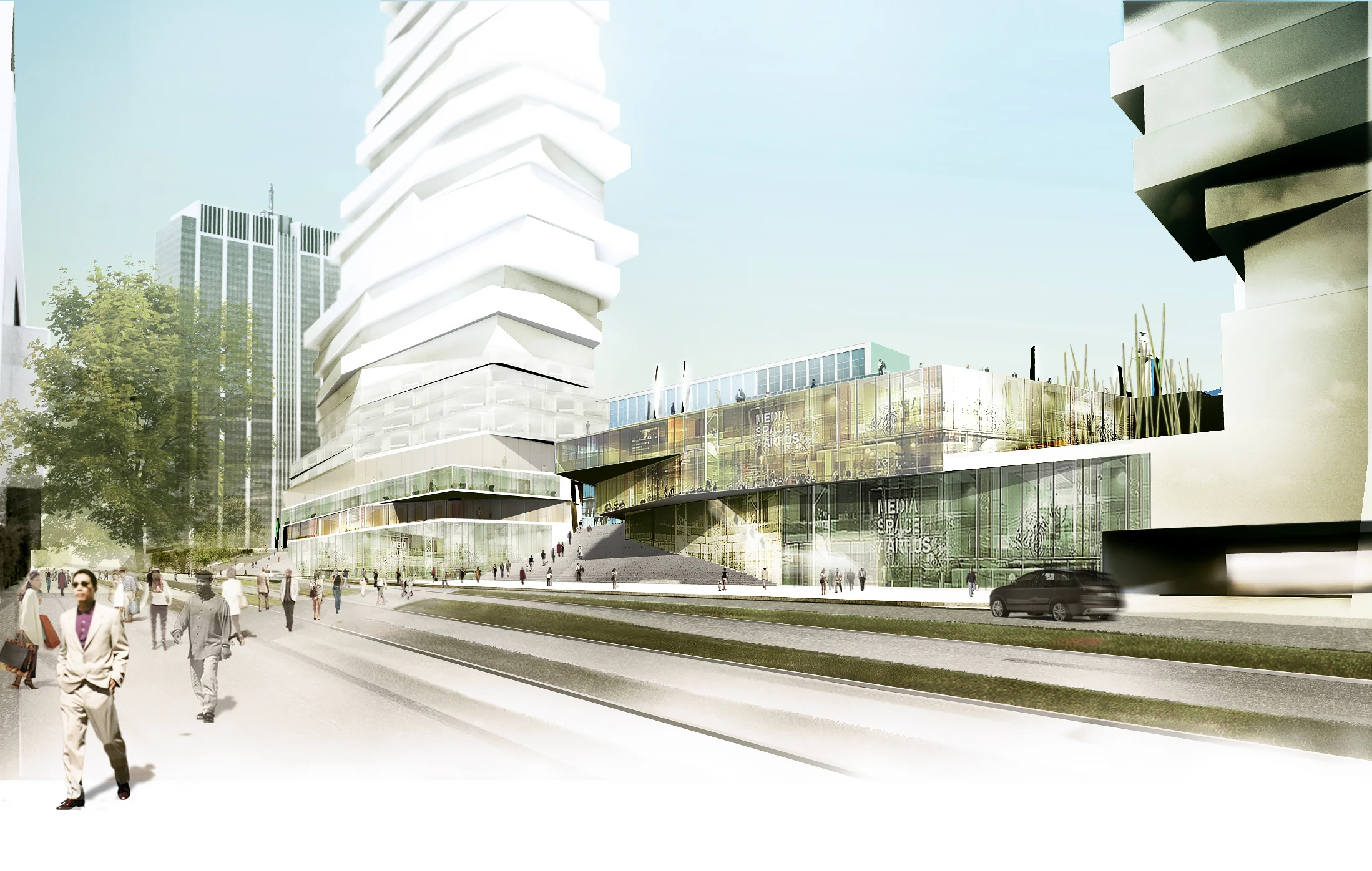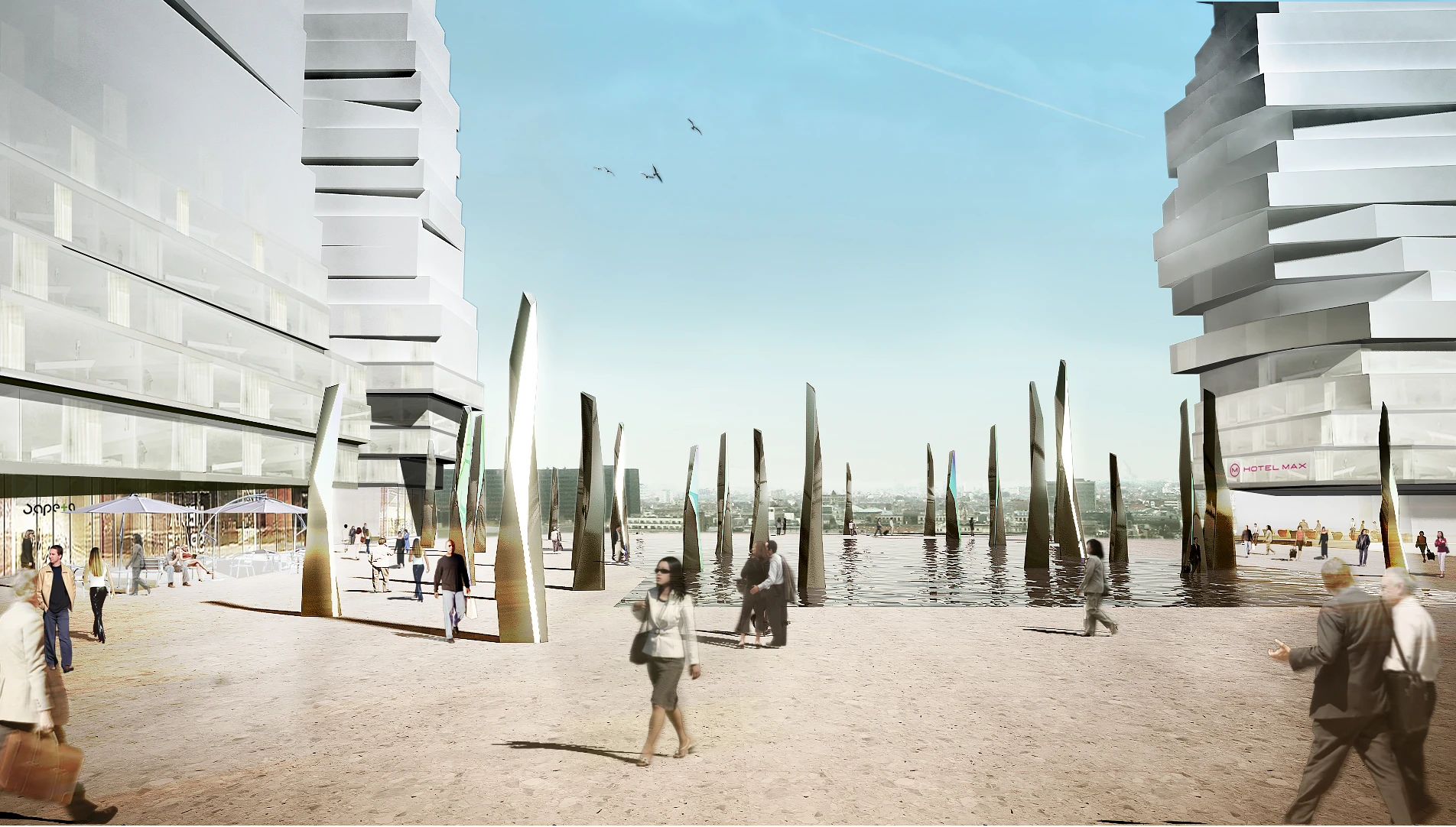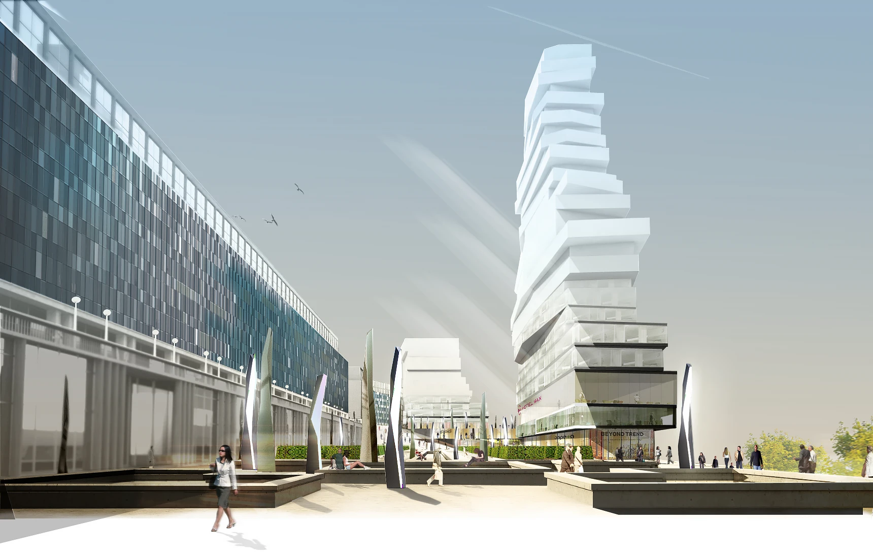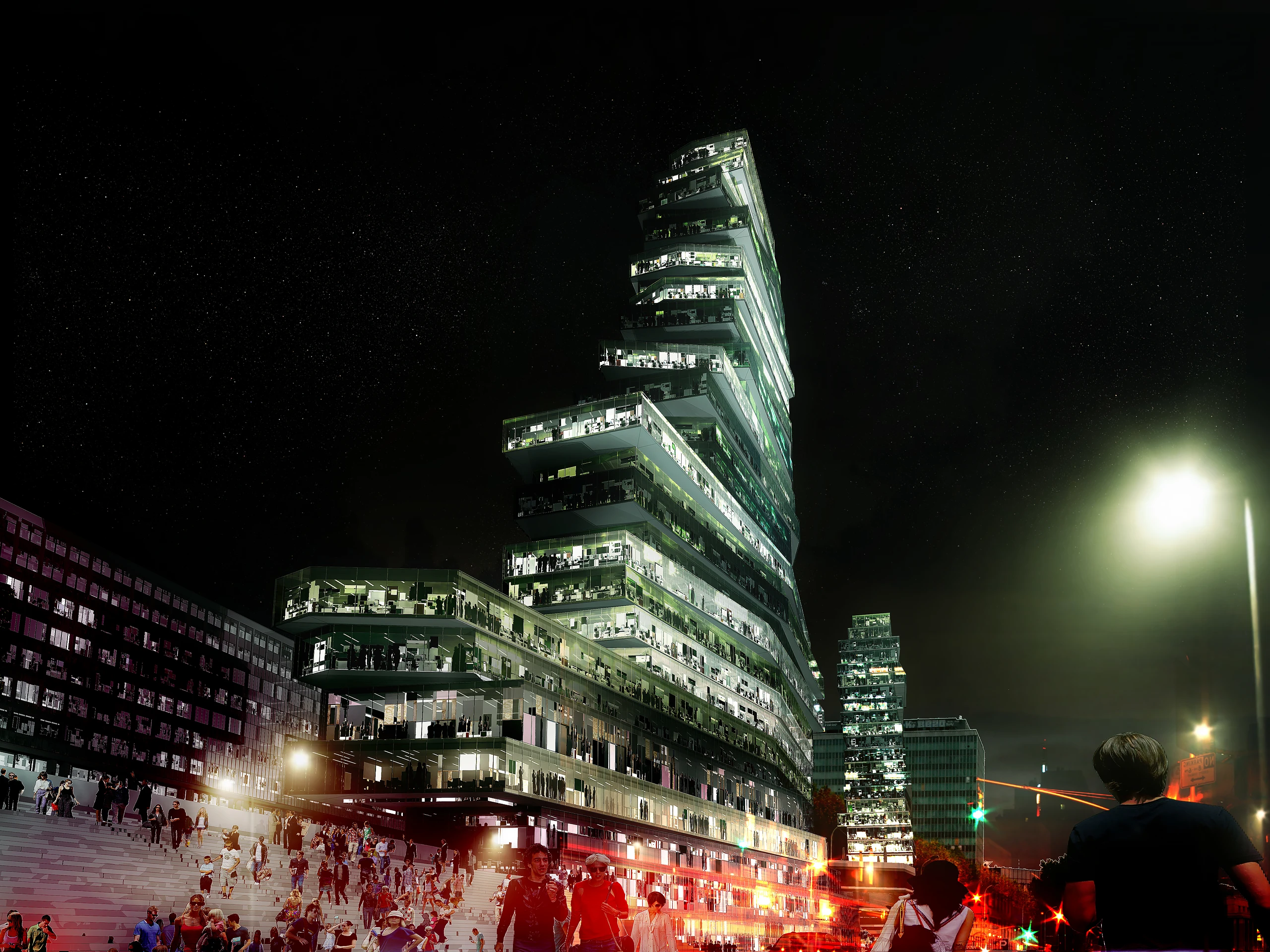 The redevelopment project, BELAIR, aims to provide a better connection between the upper town and the lower town. It includes the renovation of a number of buildings in and around the Pachecolaan and the Koningsstraat and of the recently renovated Finance Tower just behind it. The joint plan also envisages the construction of new buildings on the site, including two symbolic buildings in the form of triangles with “offset” floors that look roughly stacked on top of each other.