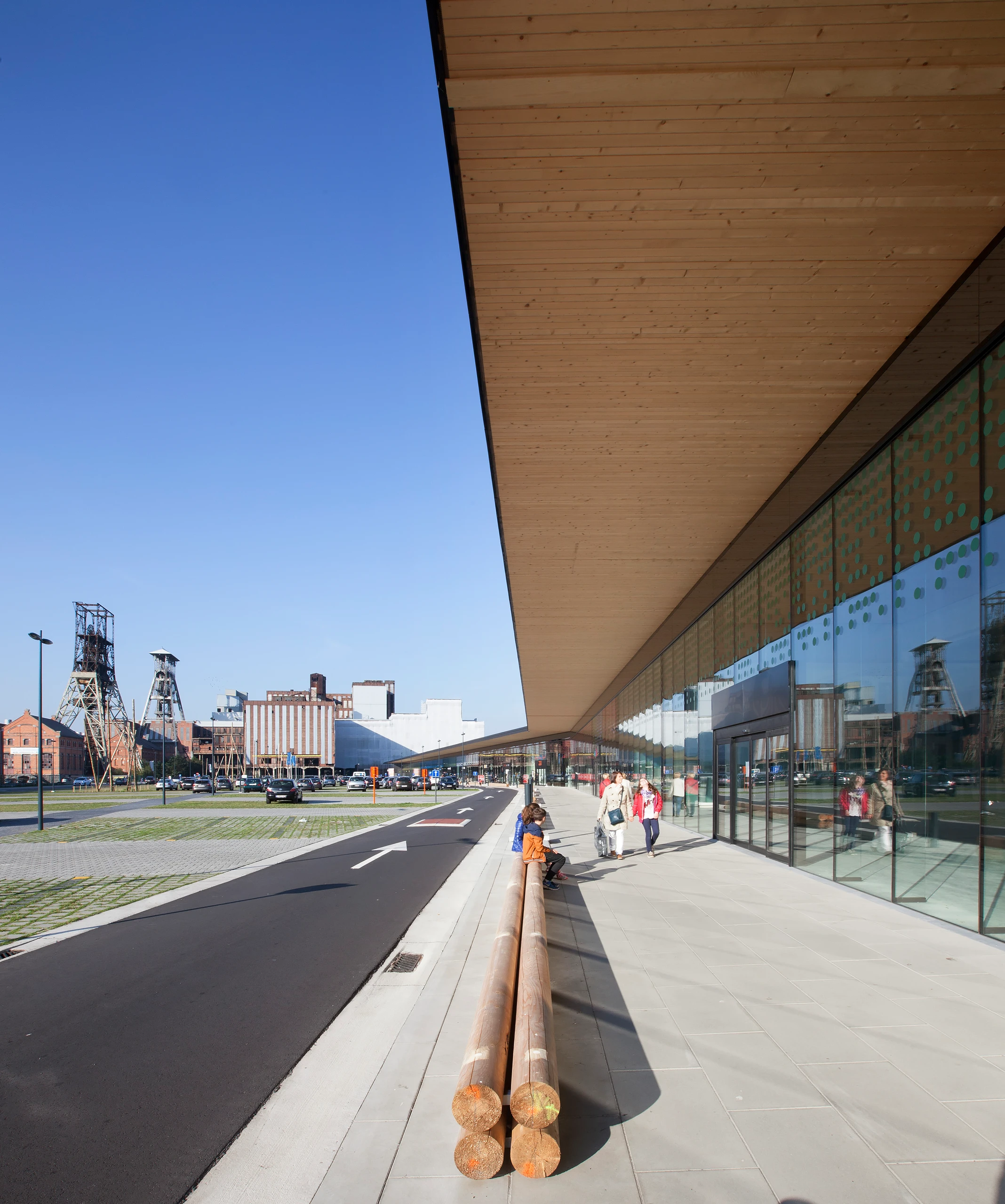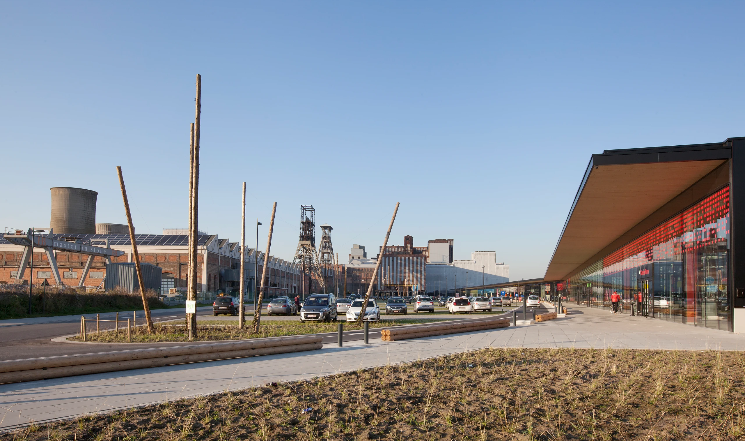 The design strategy involved integrating commerce into the natural landscape, with the retail base extending along the slope of a historic mine terril, embodying the site’s mining heritage. The architectural approach emphasized high-quality, sustainable materials such as wooden floor elements (Kielsteg), ensuring fully integrated technical and storage areas within the rear façade. A prominent feature is the extensive green roof, which covers at least 18,000m² and is free of any roof equipment, underlining the project’s commitment to sustainability.