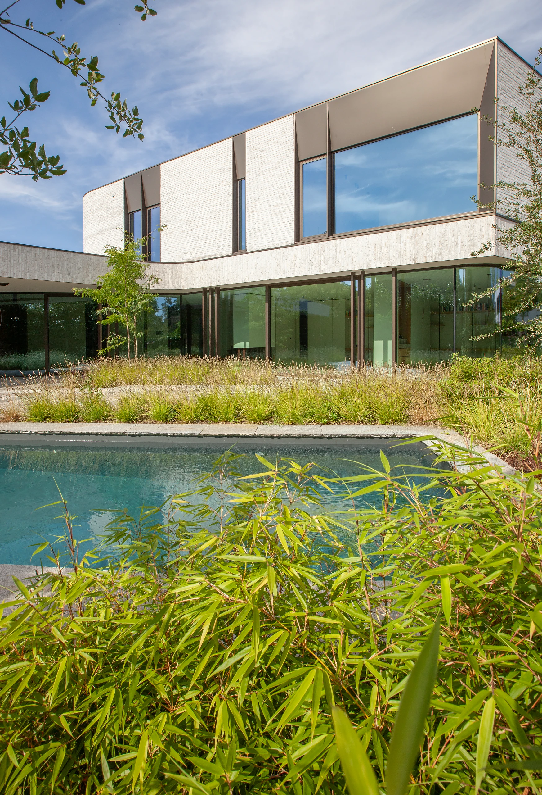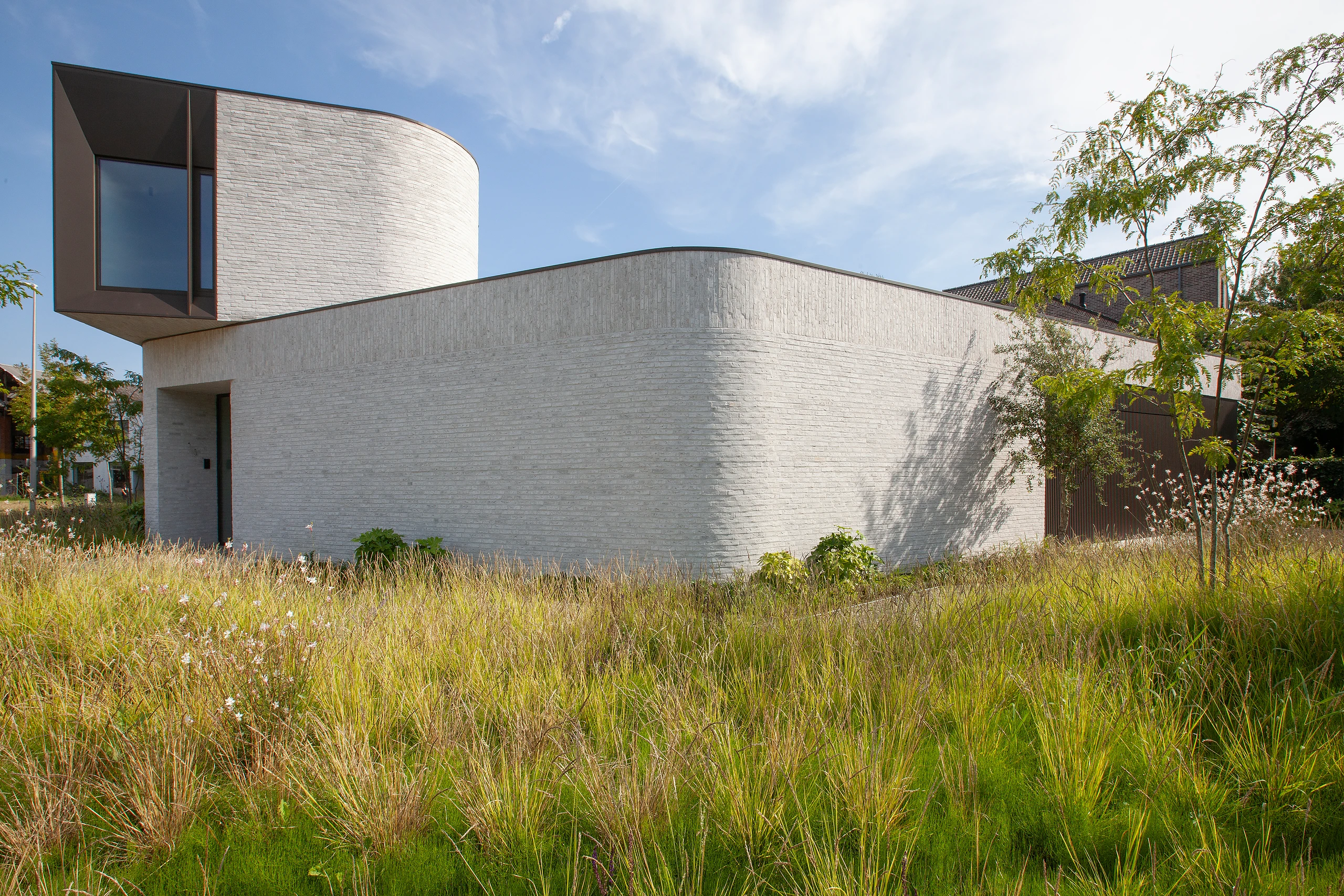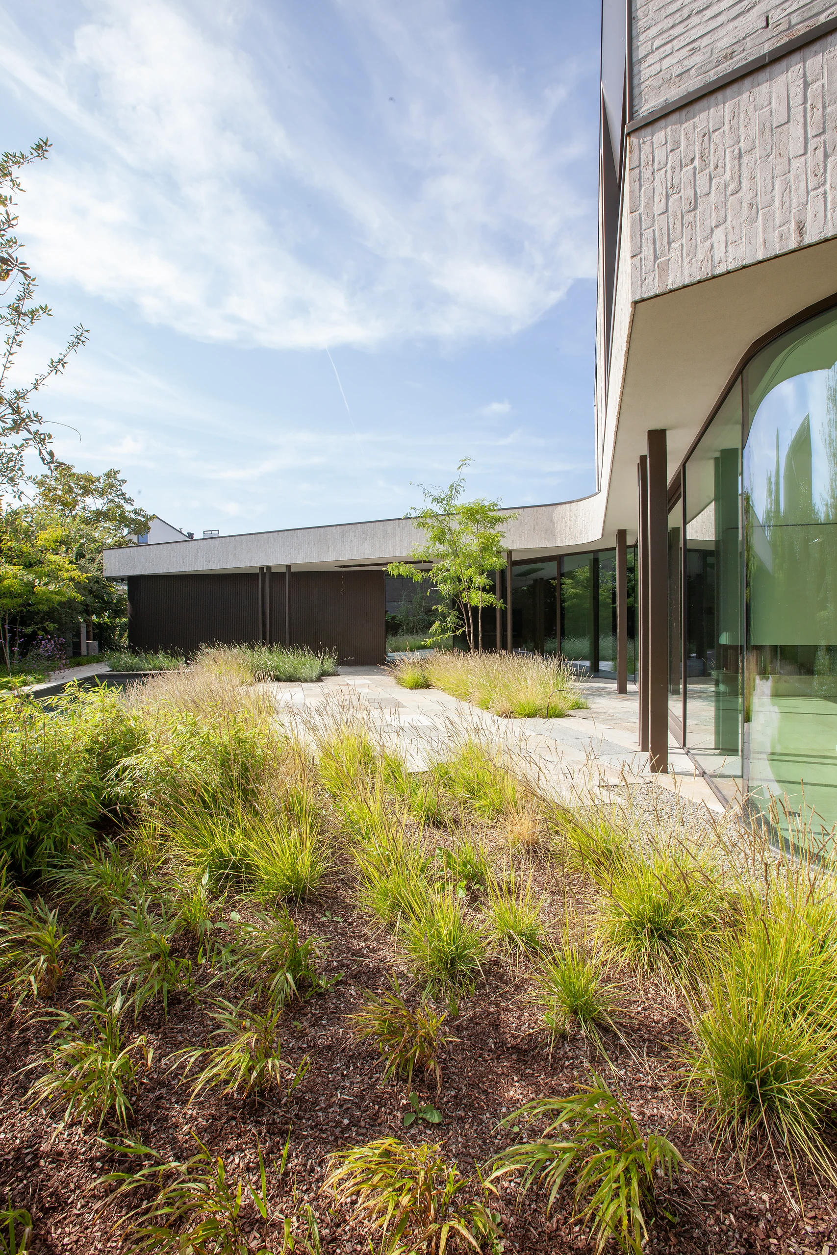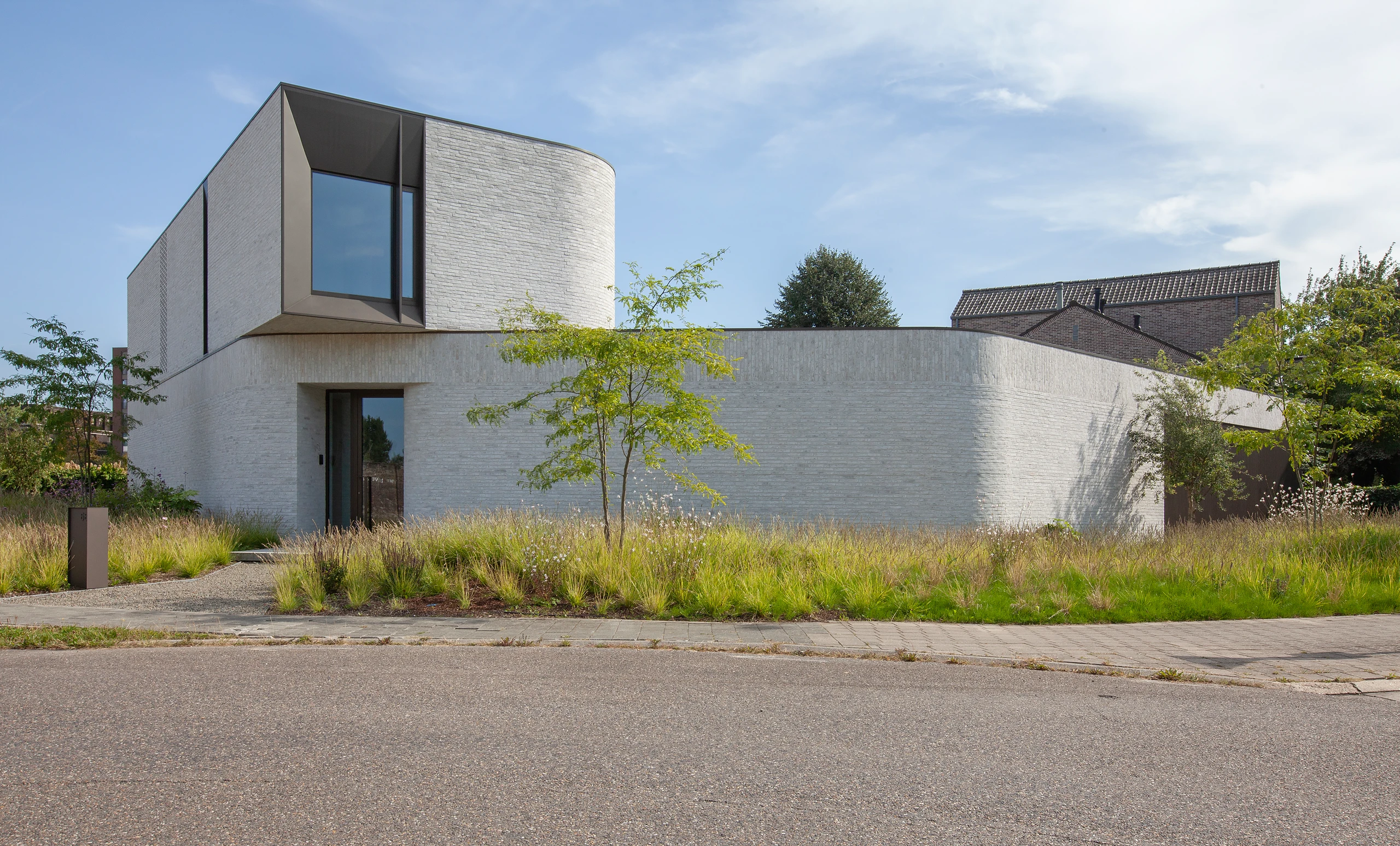An arc-shaped volume was designed, closed to the street but completely open to the rear. The shape creates a certain patio feeling in the area behind. The surrounding plantings further enhance this feeling.