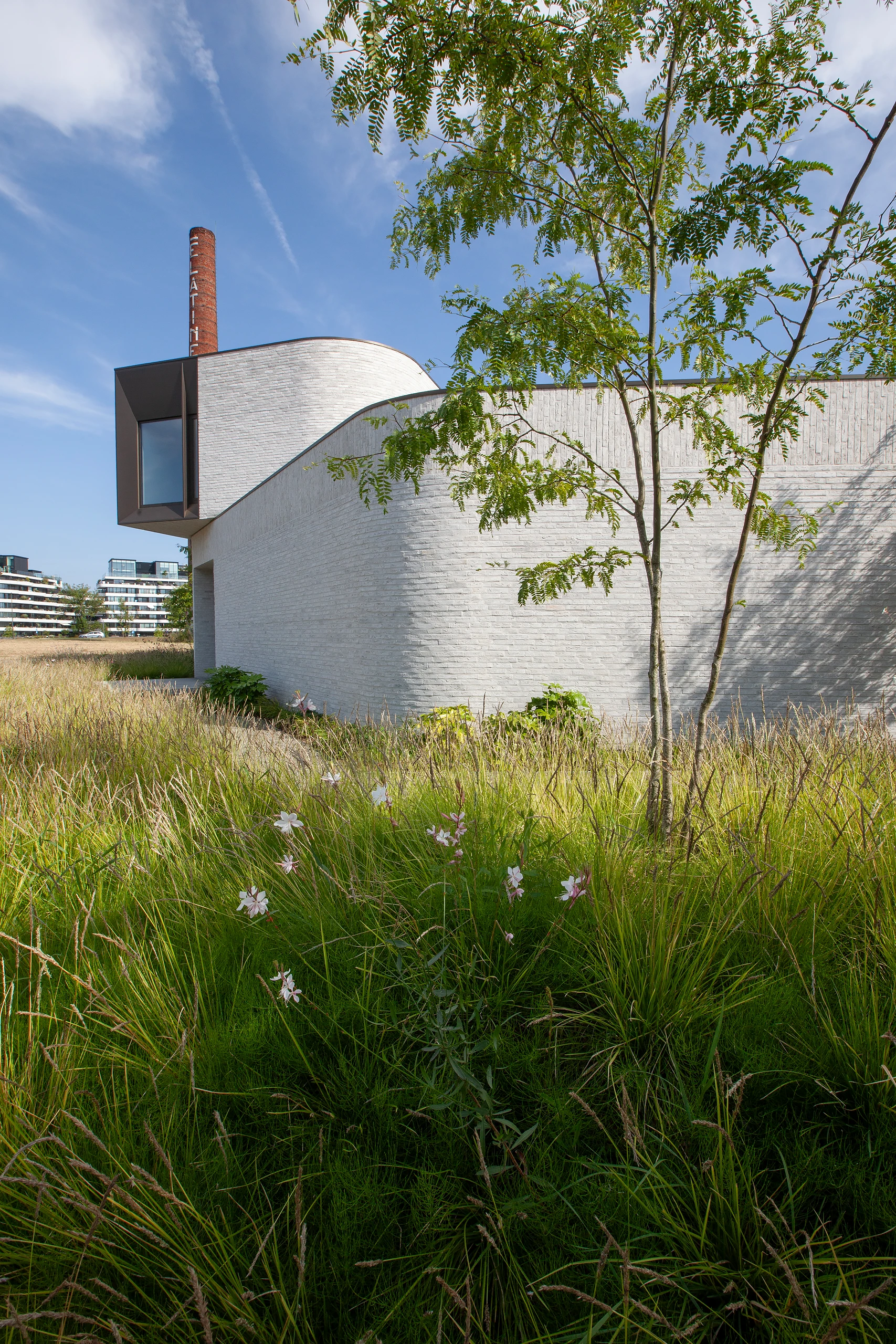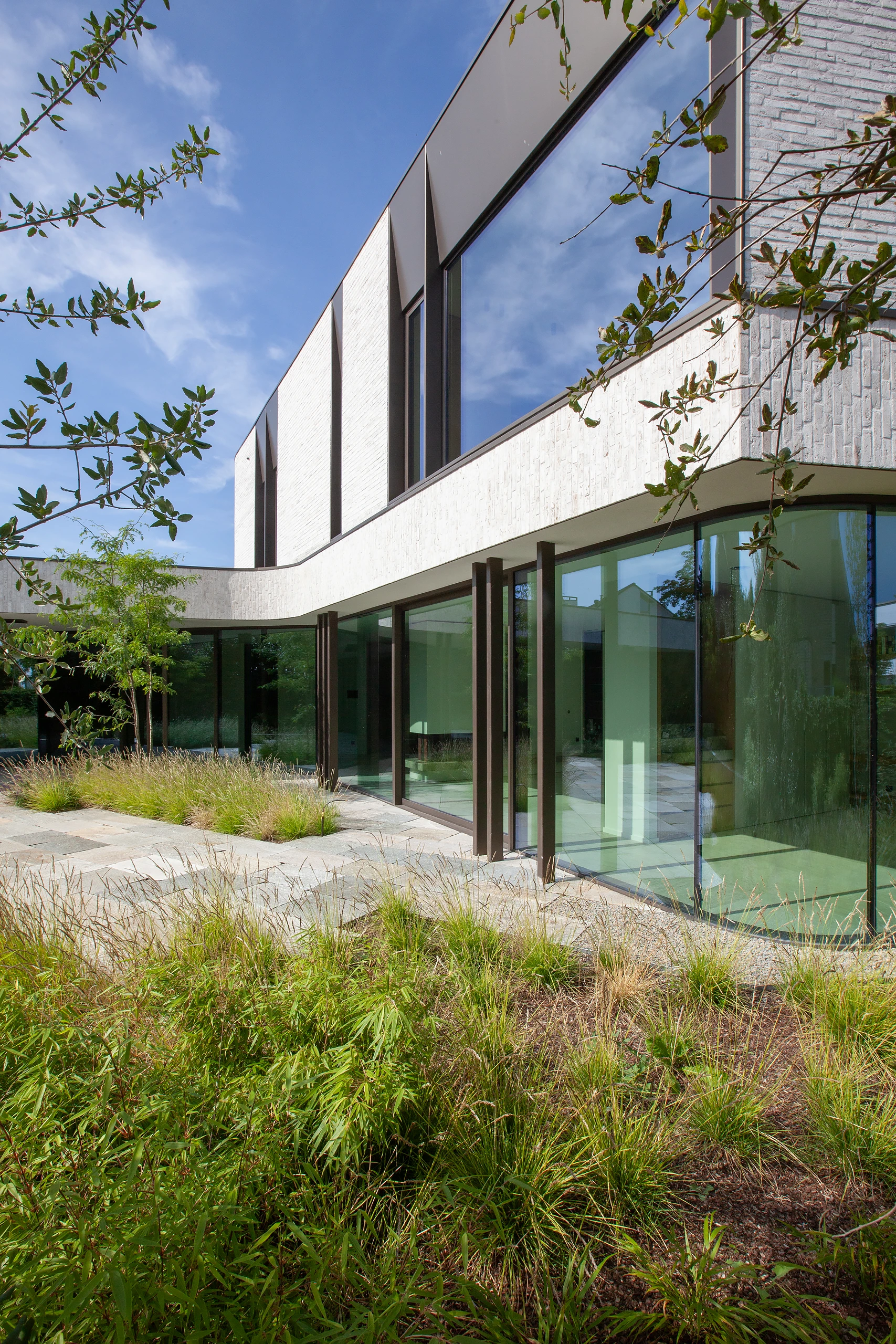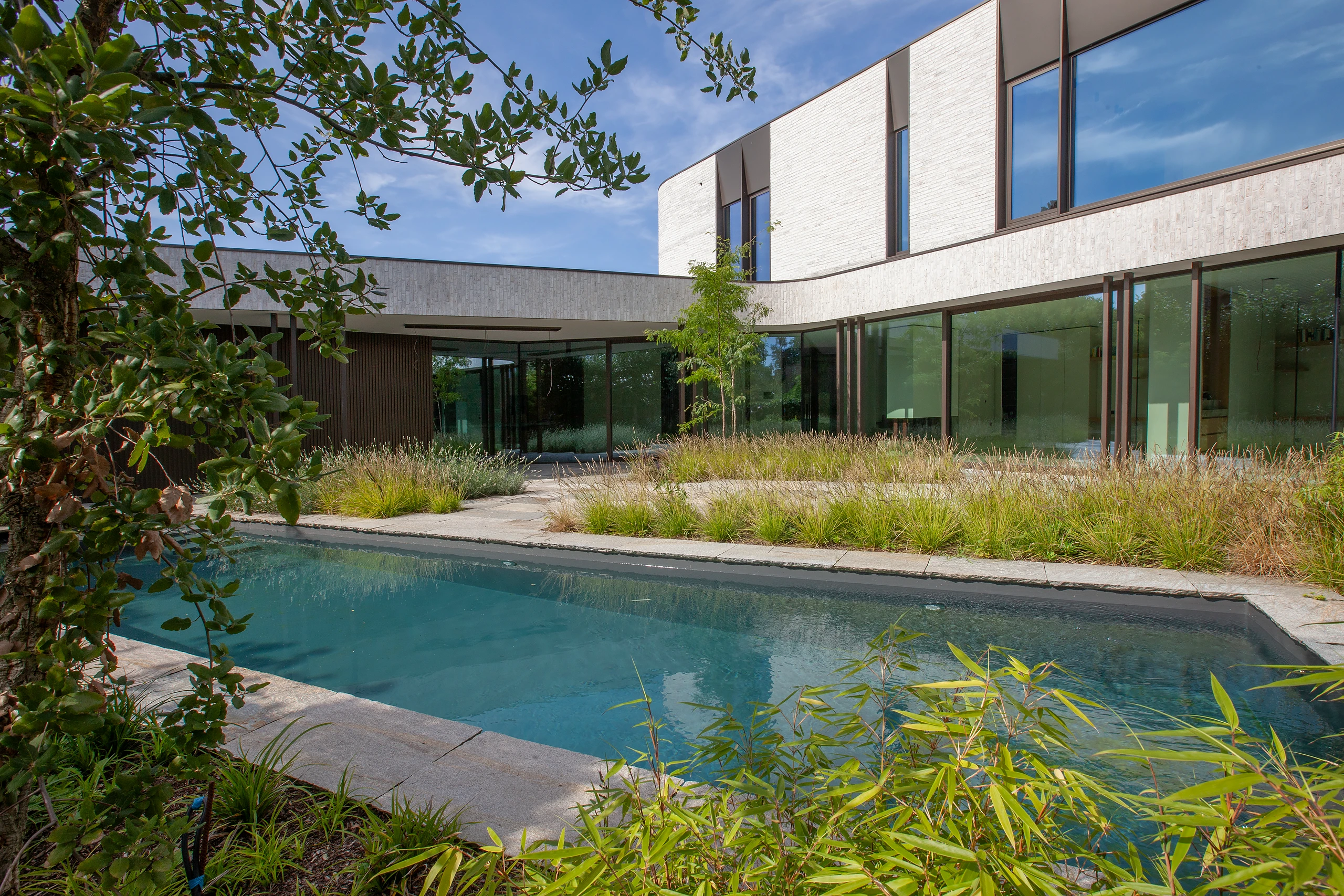 An arc-shaped volume was designed, closed to the street but completely open to the rear. The shape creates a certain patio feeling in the area behind. The surrounding plantings further enhance this feeling.