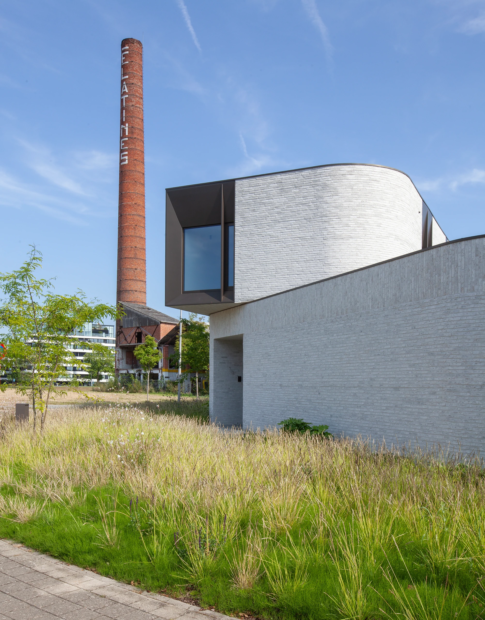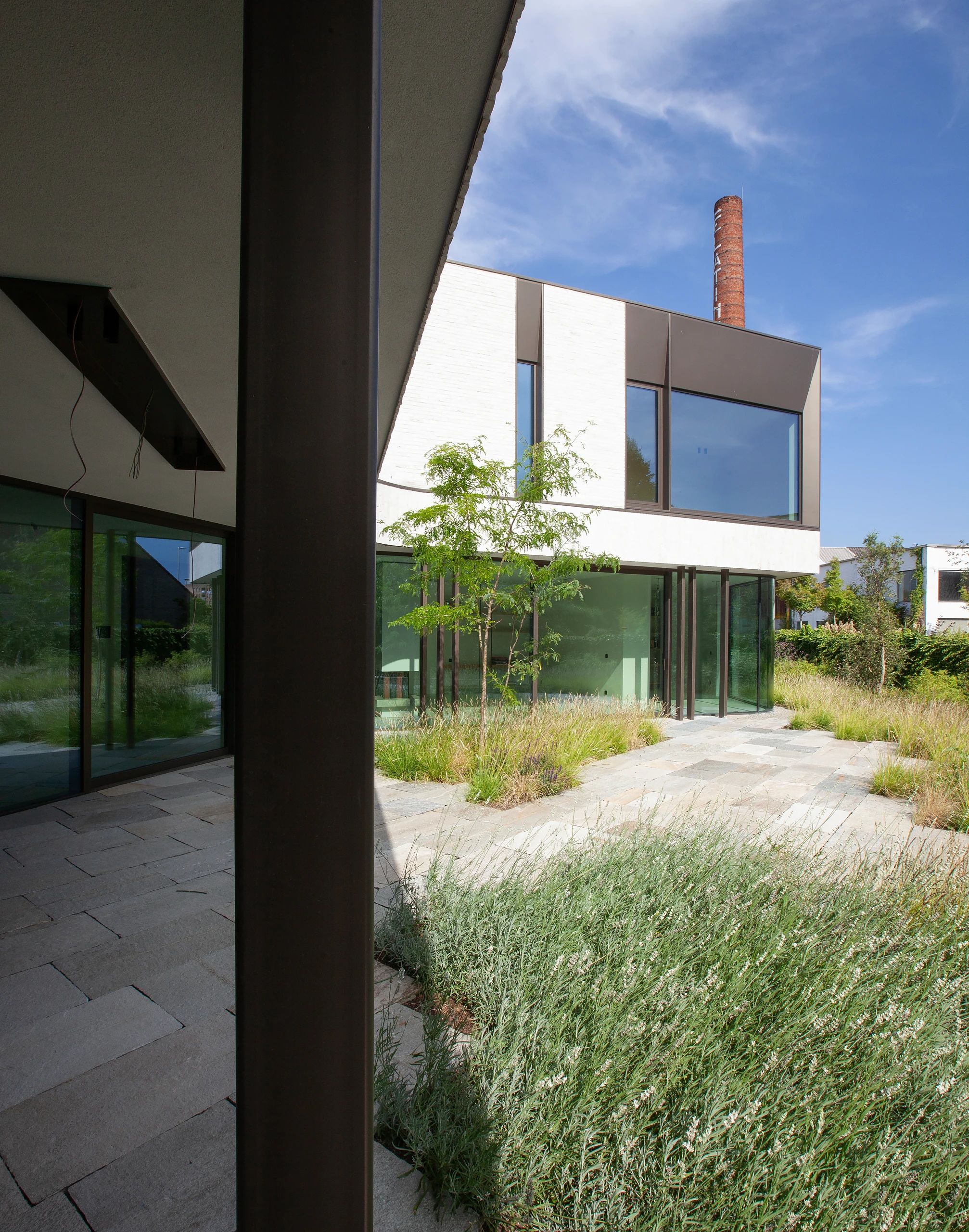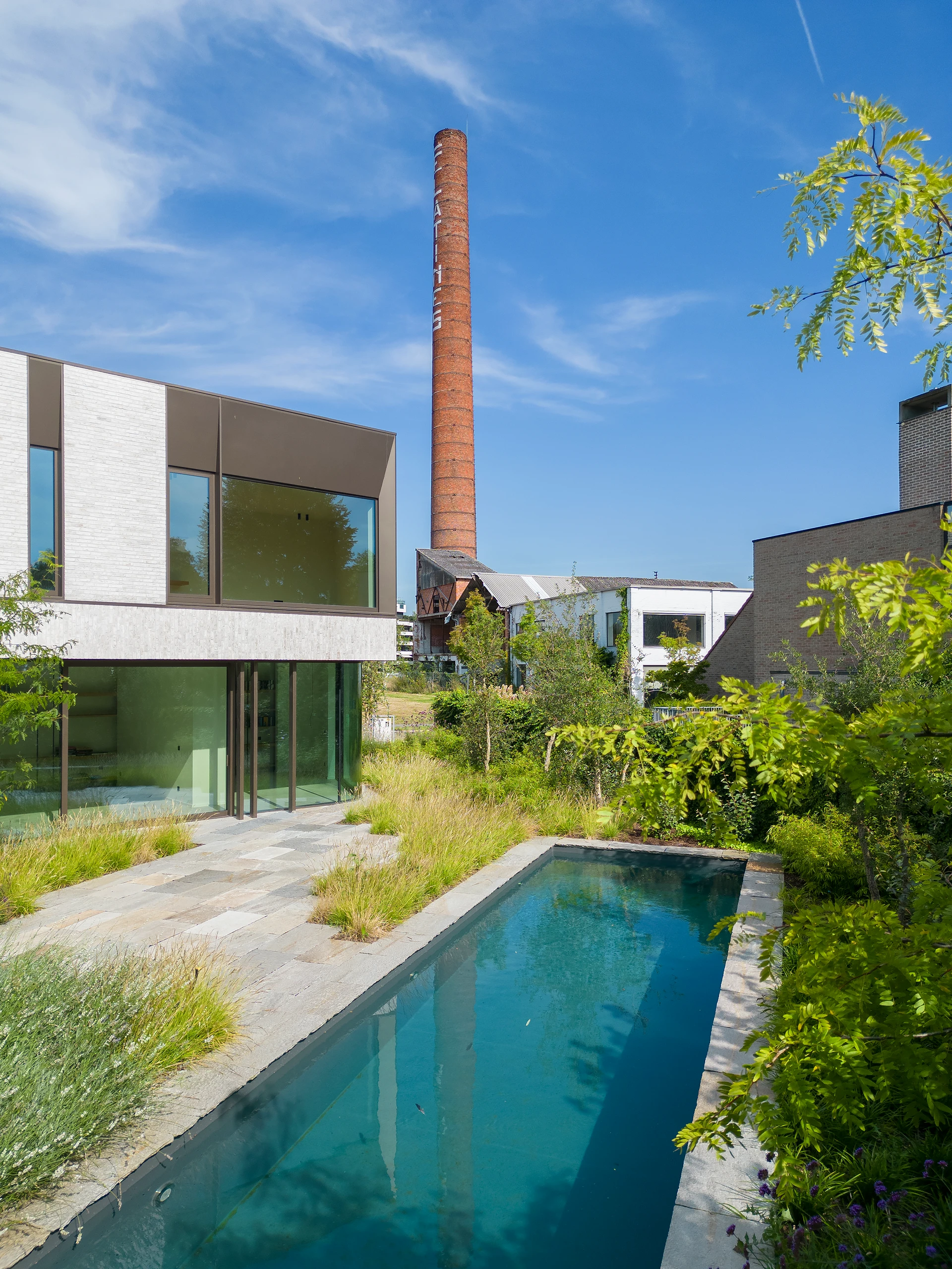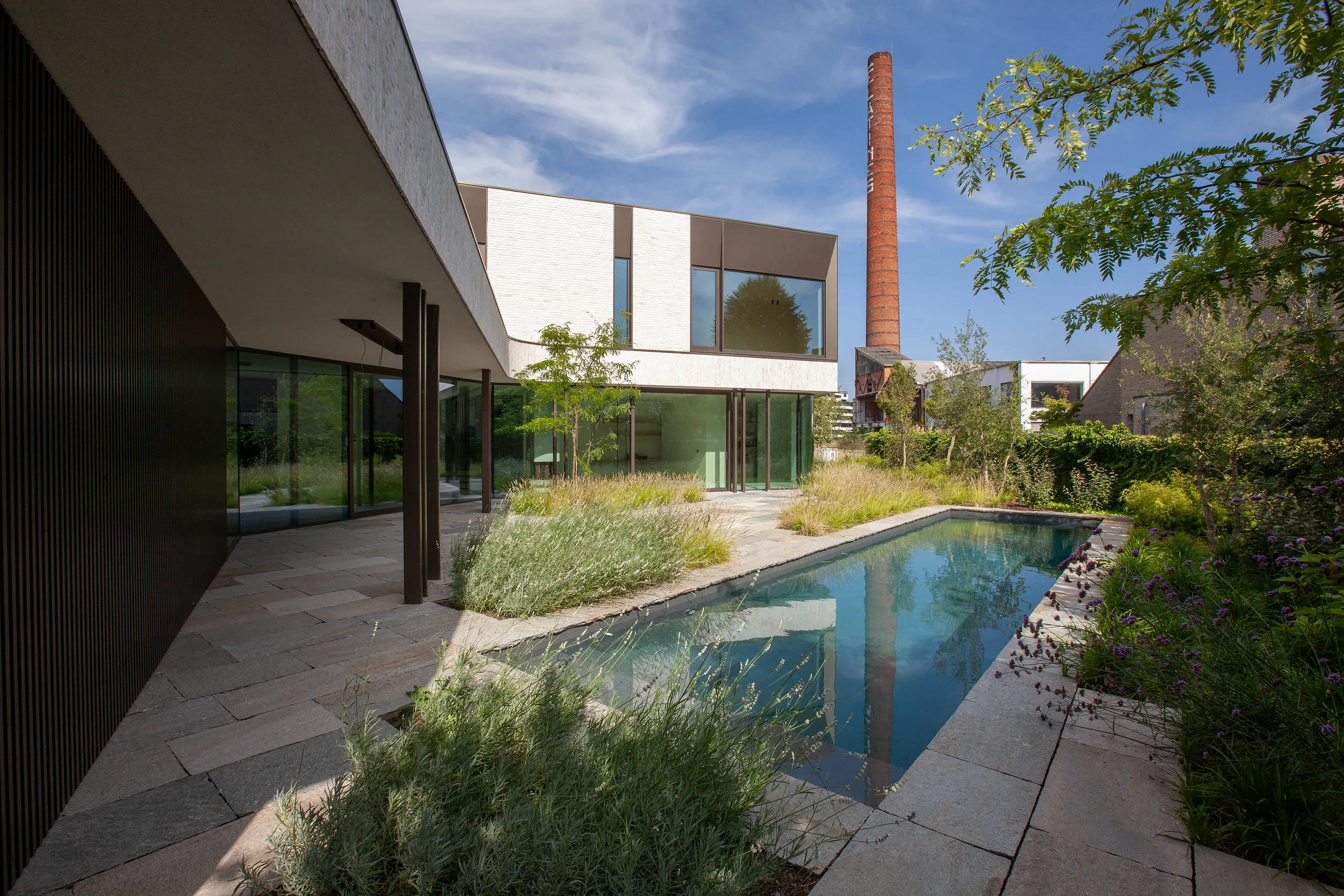 An arc-shaped volume was designed, closed to the street but completely open to the rear. The shape creates a certain patio feeling in the area behind. The surrounding plantings further enhance this feeling.