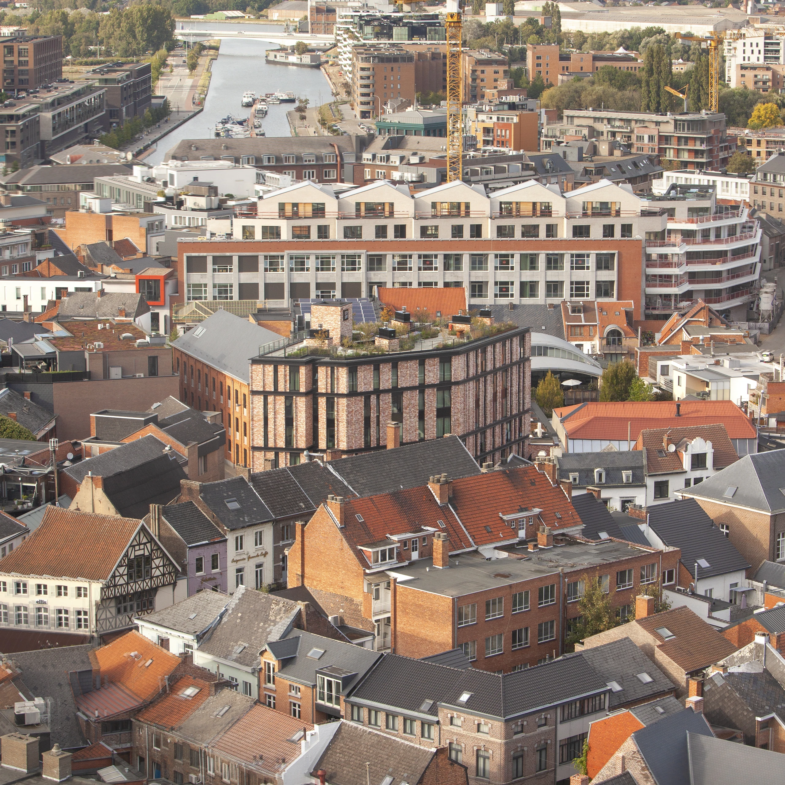 Situated in the city center of Hasselt, a new development aims to revitalize the connection between the bustling Zuivelmarkt and Raamstraat by introducing a pass-through and transforming a courtyard into a semi-private square, thus enhancing the public character of the area. To compensate for the space lost to these communal areas, a distinctive architectural feature – a dynamic monolith – was erected along Raamstraat. This structure is designed to integrate seamlessly with its surroundings, ensuring that it does not overshadow the streetscape, while maintaining privacy and quality of life for both future and neighboring residents.