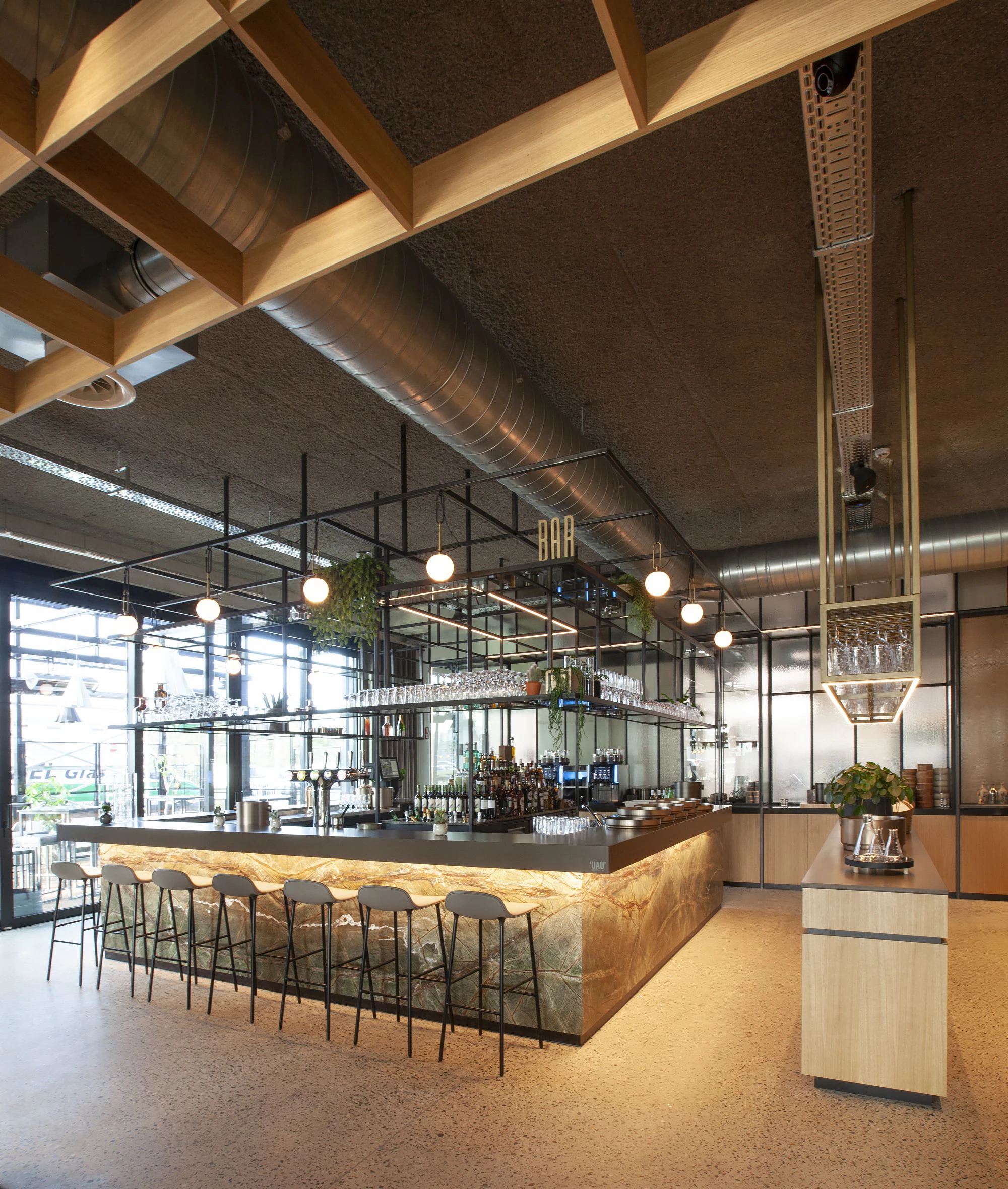 The use of different materials creates varying atmospheres for the restaurant, brasserie, and bar. The open kitchen can be felt throughout the space and the concept extends outwards through the spacious terrace. An oasis of tranquility is created in both the interior and the exterior in a Mediterranean setting. The rich choice of materials of natural stone Forest Green combined with warm oak, blank steel, and golden details form the basis of this new catering business. The central element is a conservatory-shaped structure with a deep green sofa. The lounge area includes a centrally located fireplace with seats. The use of wood felt and terrazzo, in combination with the abundance of greenery and golden accents, creates softness and warmth in the interior.
