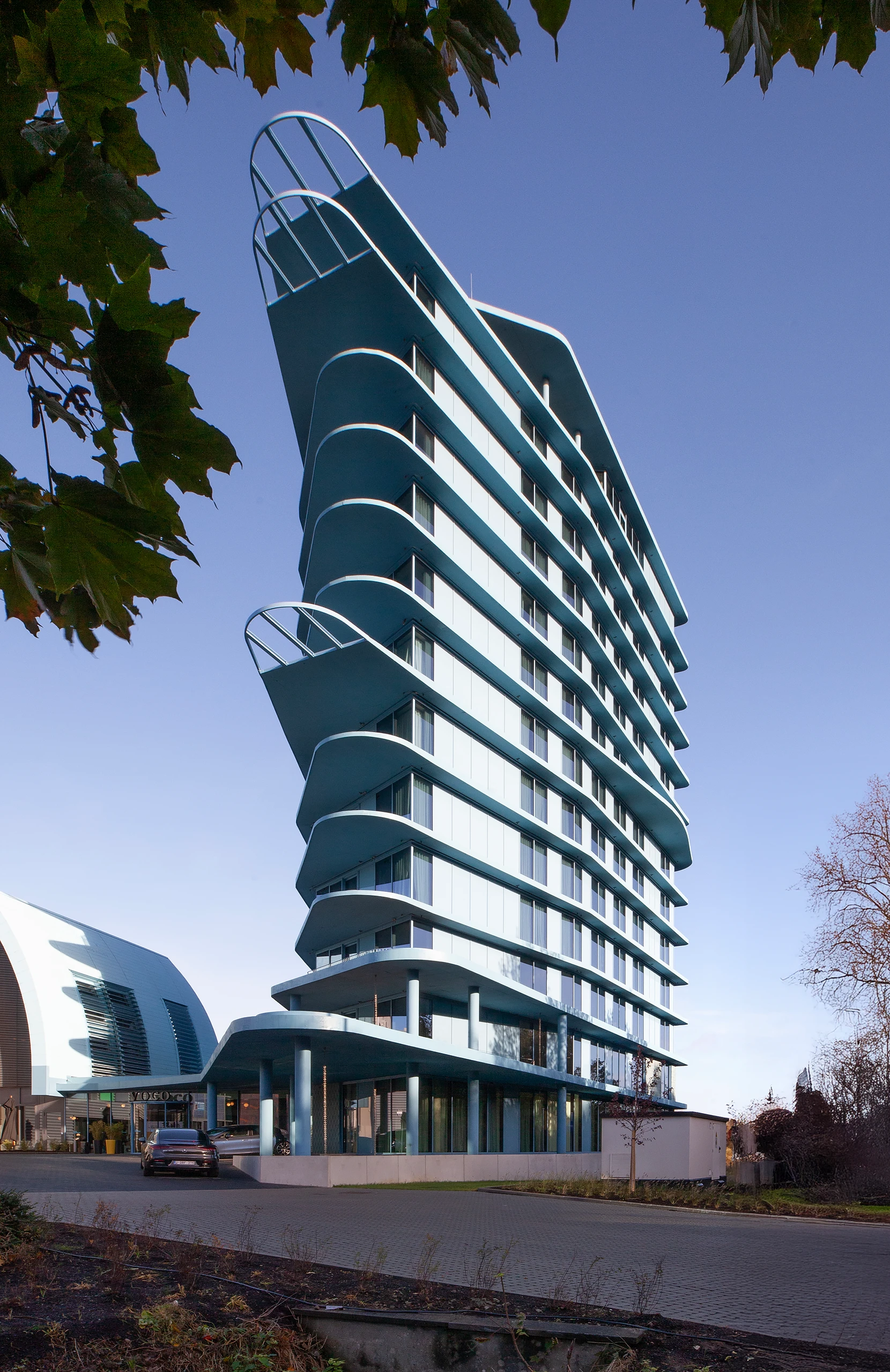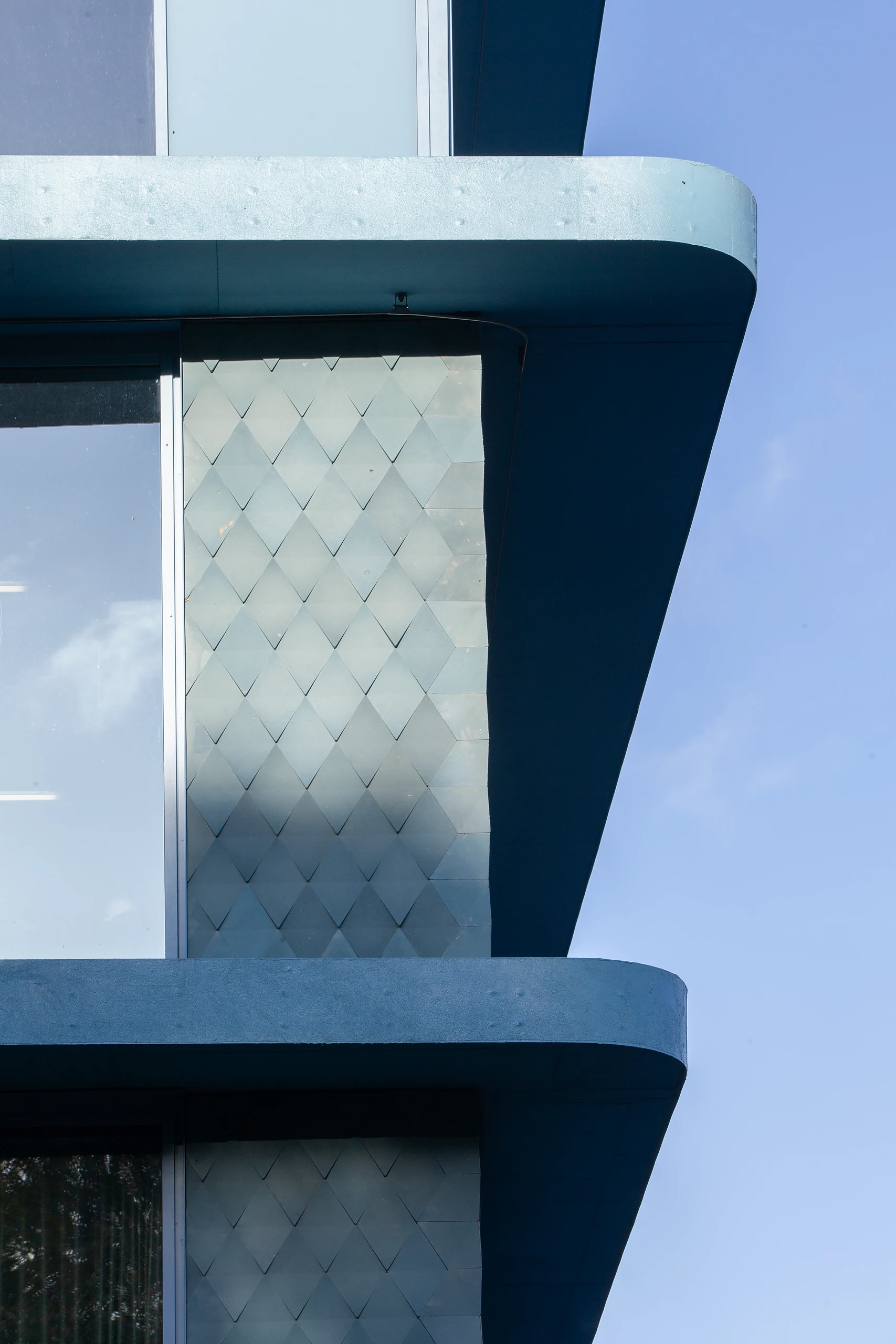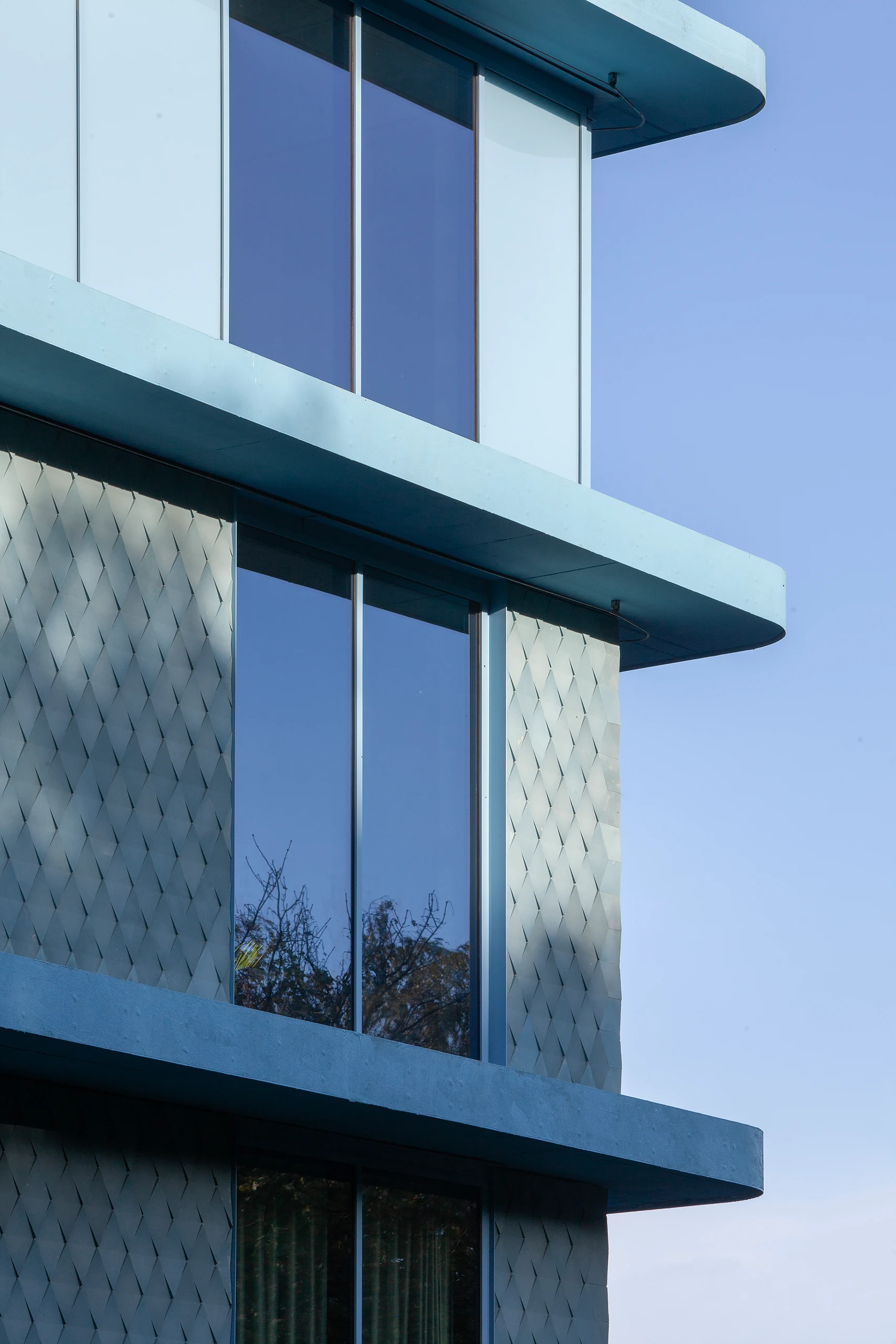 The concrete skeleton forms the core of the building, capable of adapting to future flexible uses. The facade captures a snapshot of innovation and can be replaced in the future with hybrid and energy facades. But why the blue? The various materials were reduced to their essence. To achieve a unified character, a single color extends through all the materials, ensuring that their individual designs are subordinated to the whole. The blue silhouette enters into a dialogue with the Belgian sky, shifting from grey to light, from light to dark blue.