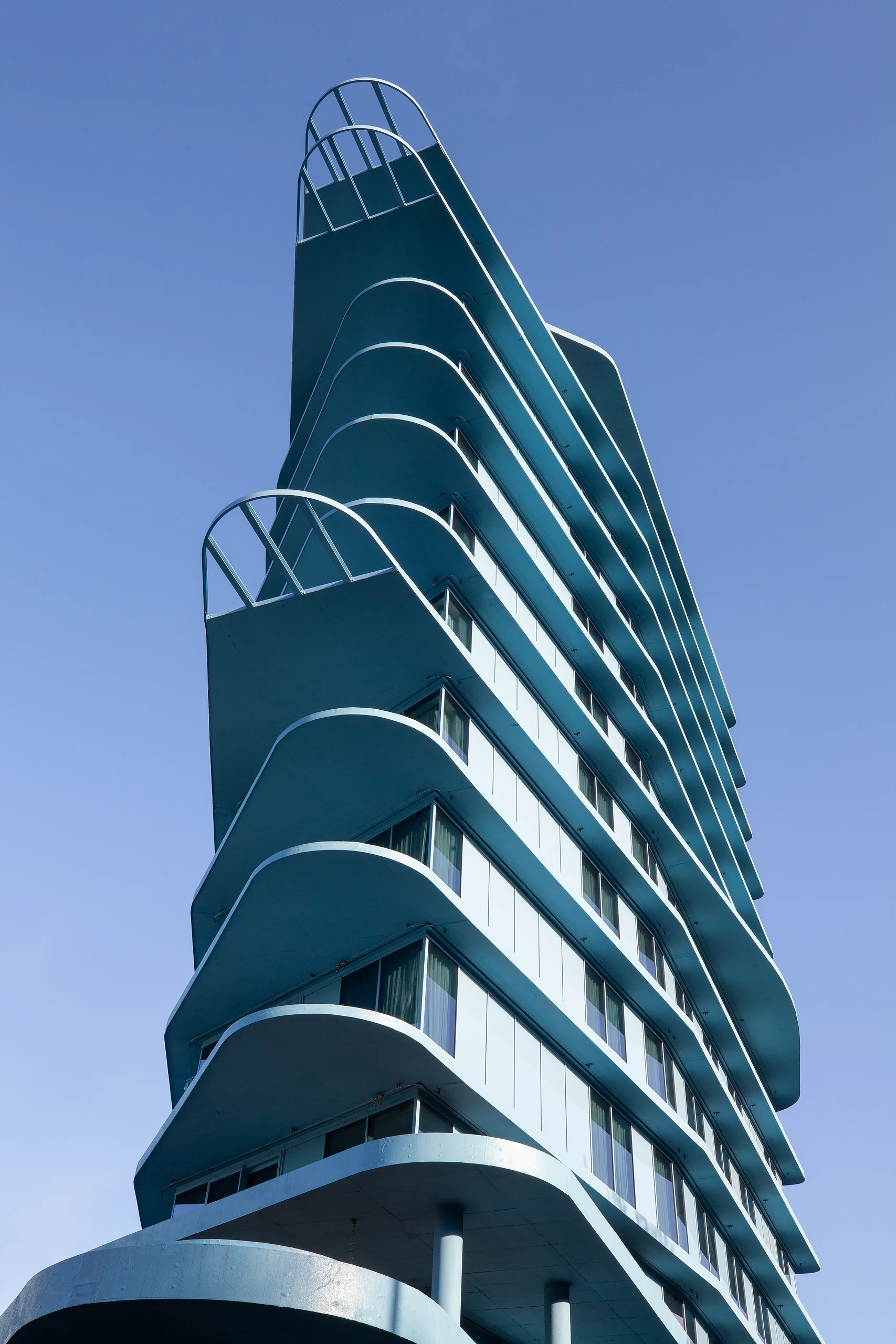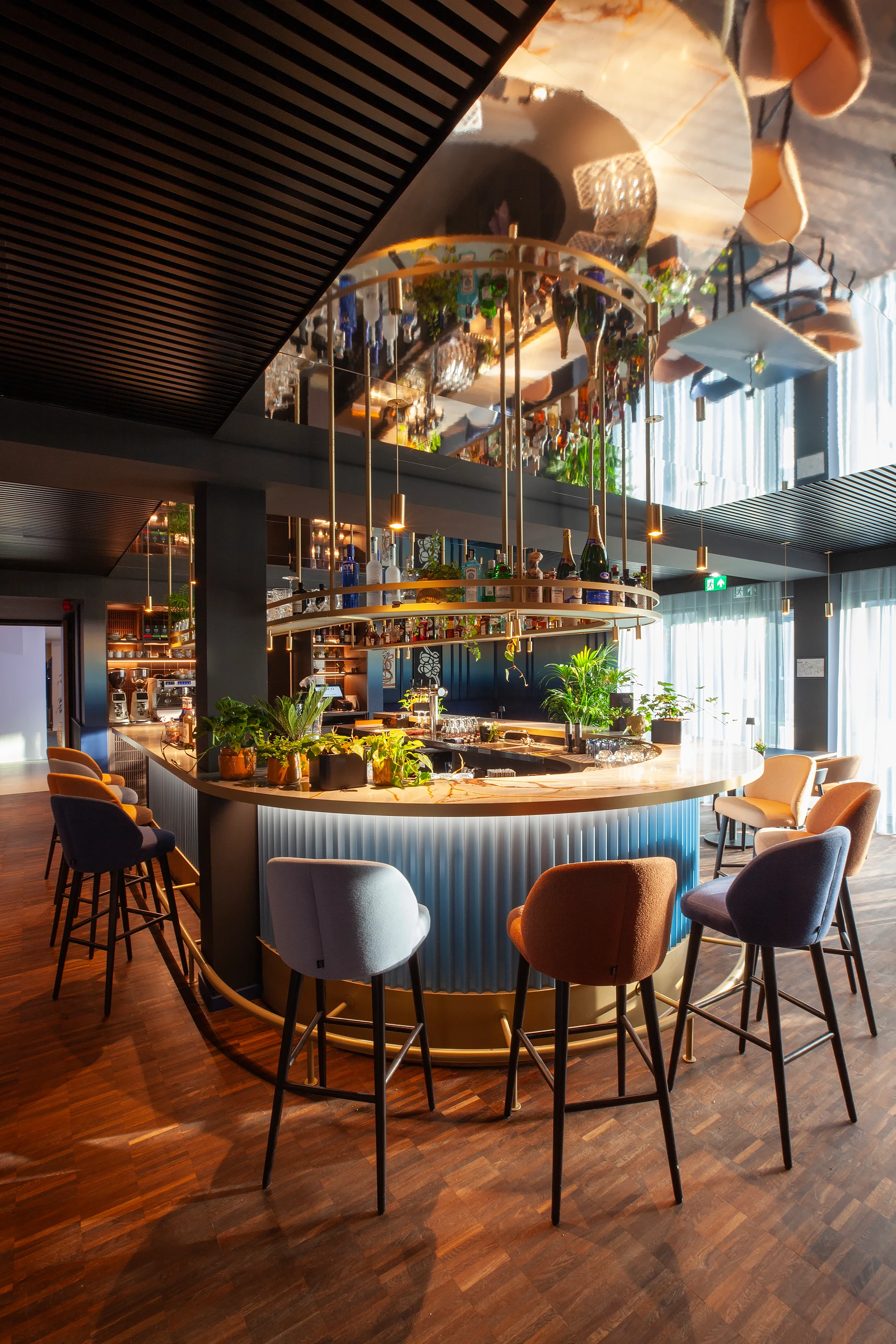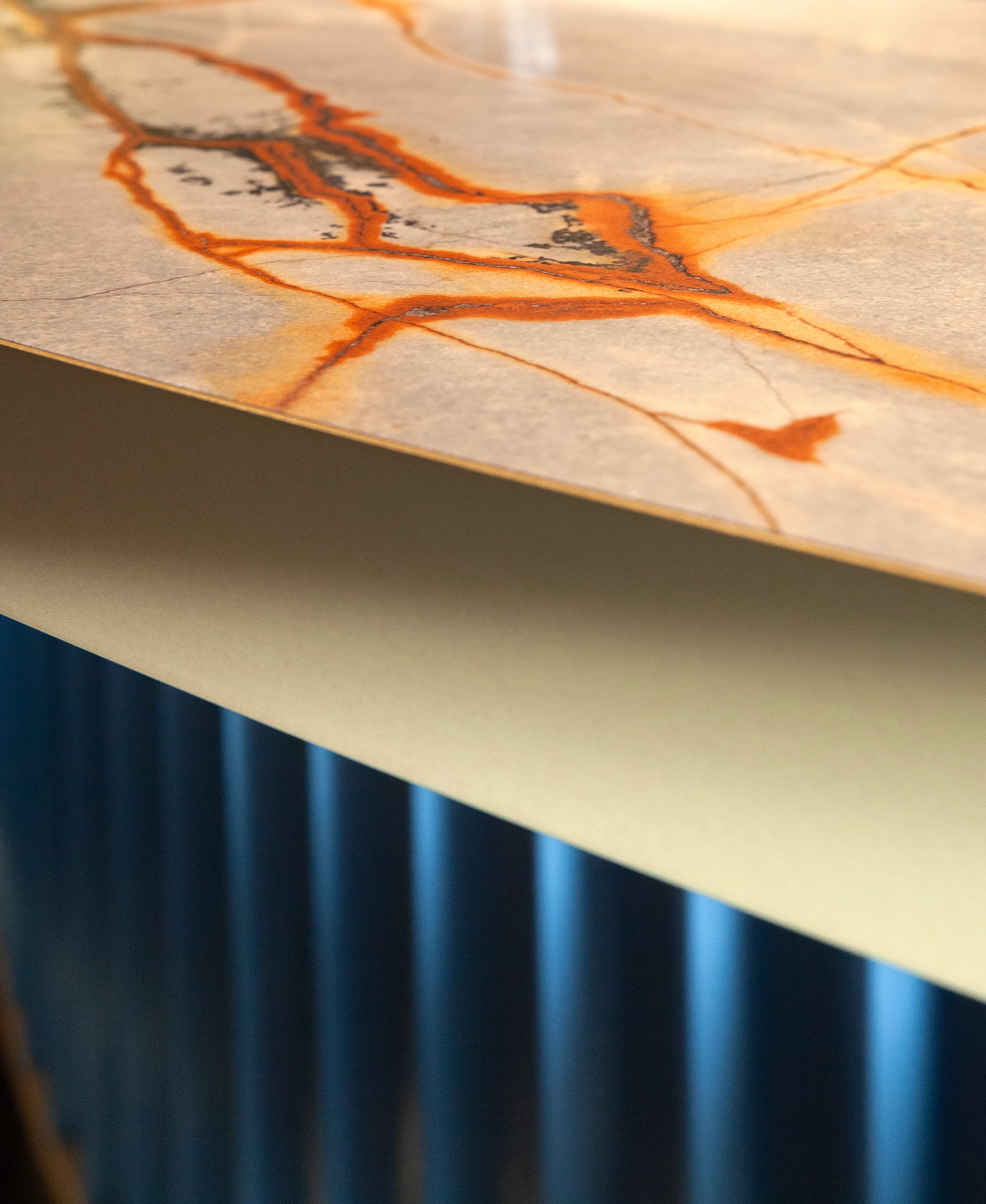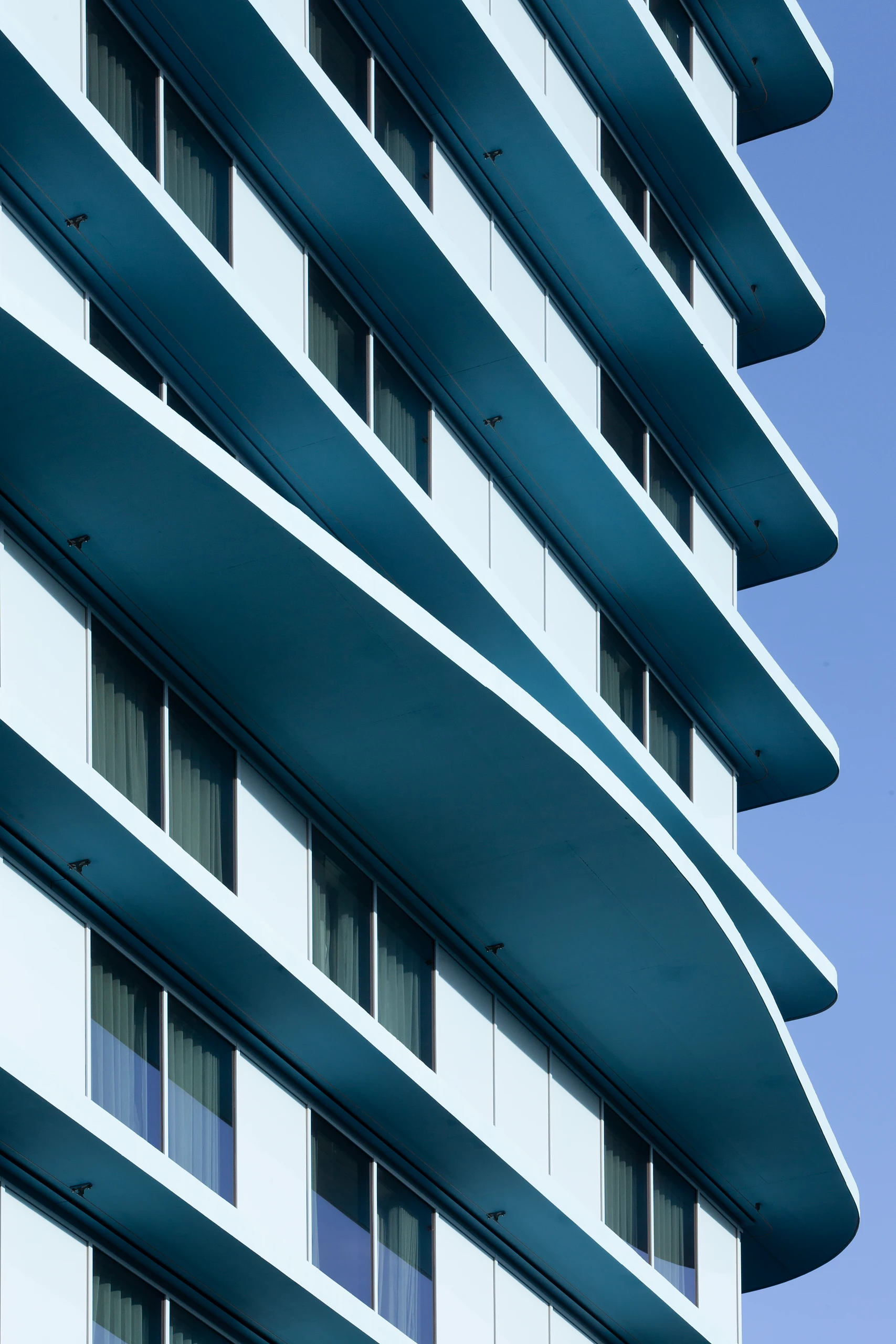The concrete skeleton forms the core of the building, capable of adapting to future flexible uses. The facade captures a snapshot of innovation and can be replaced in the future with hybrid and energy facades. But why the blue? The various materials were reduced to their essence. To achieve a unified character, a single color extends through all the materials, ensuring that their individual designs are subordinated to the whole. The blue silhouette enters into a dialogue with the Belgian sky, shifting from grey to light, from light to dark blue.