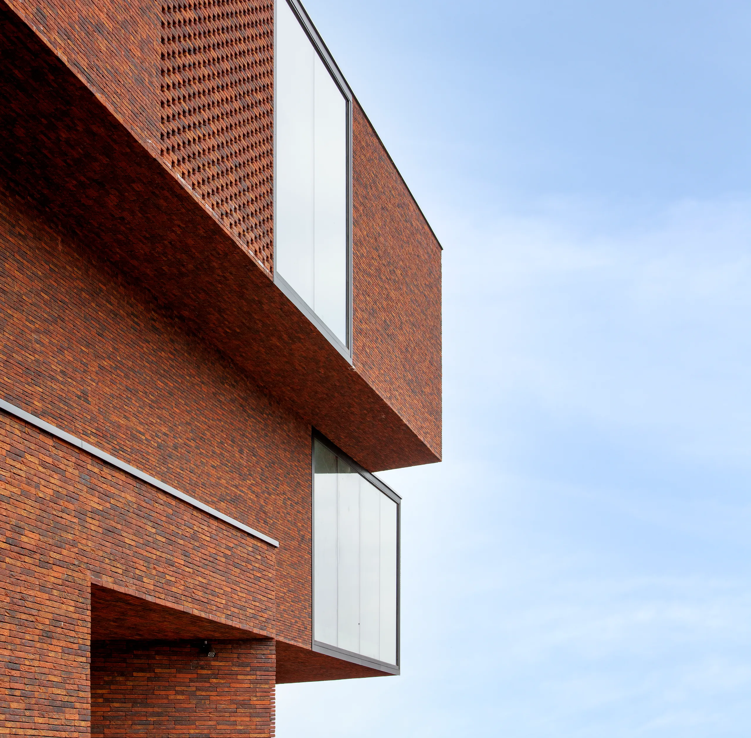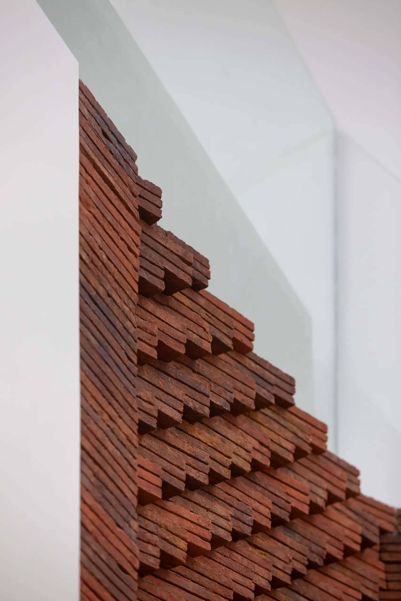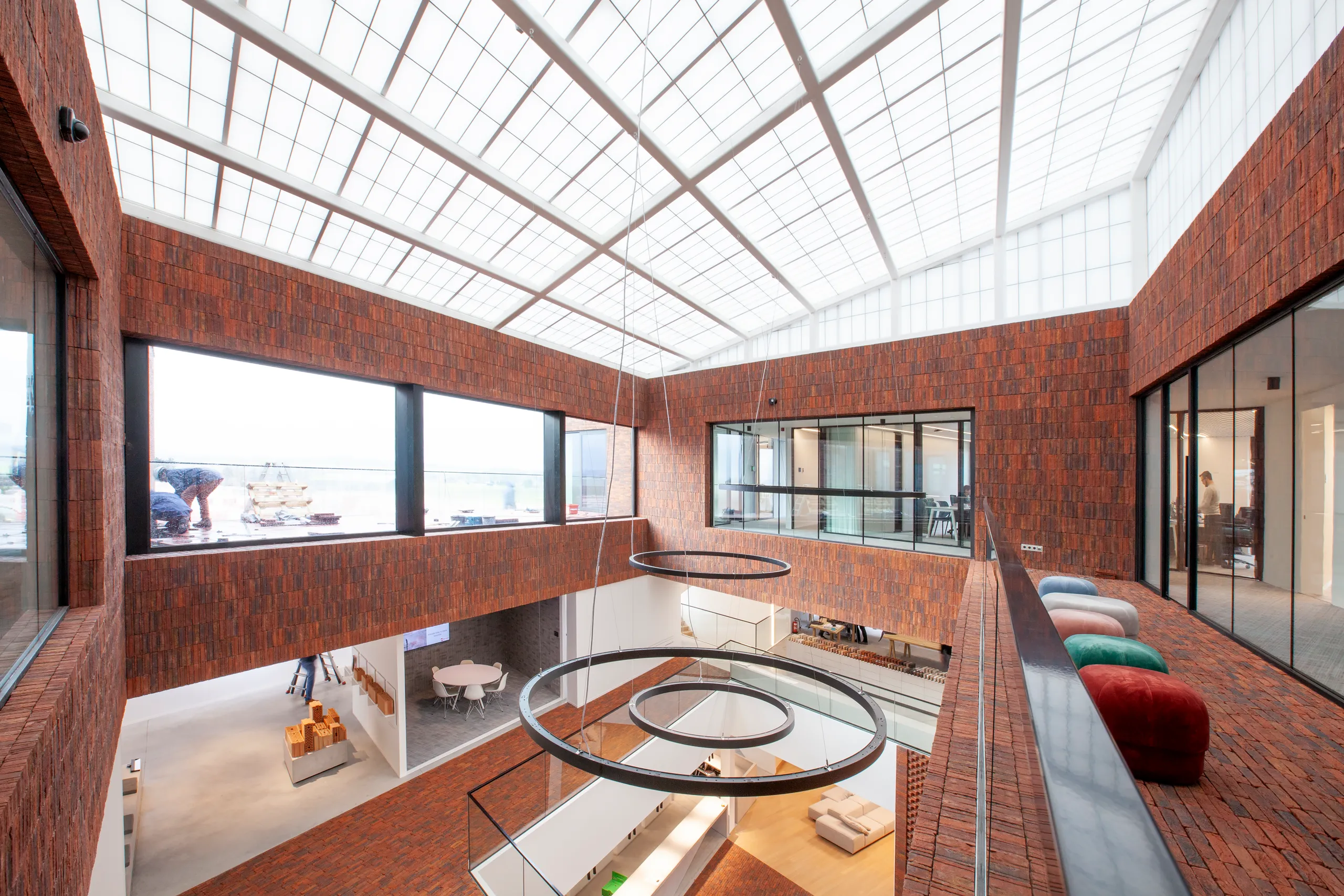 The new building’s ground floor, with its welcoming U-shape facing the street, houses the reception and administrative areas, symbolizing openness and accessibility. Above, the first floor’s parallelogram shape encircles an open space, guiding visitors through an immersive showroom tour around this central void. The top floor, mirroring the ground level’s U-shape, hosts more administrative spaces and overlooks the industrial site, blending indoor and outdoor environments seamlessly. This structure reflects Nelissen Bricks’ global presence, with interiors that celebrate bricks as both art and technology.
