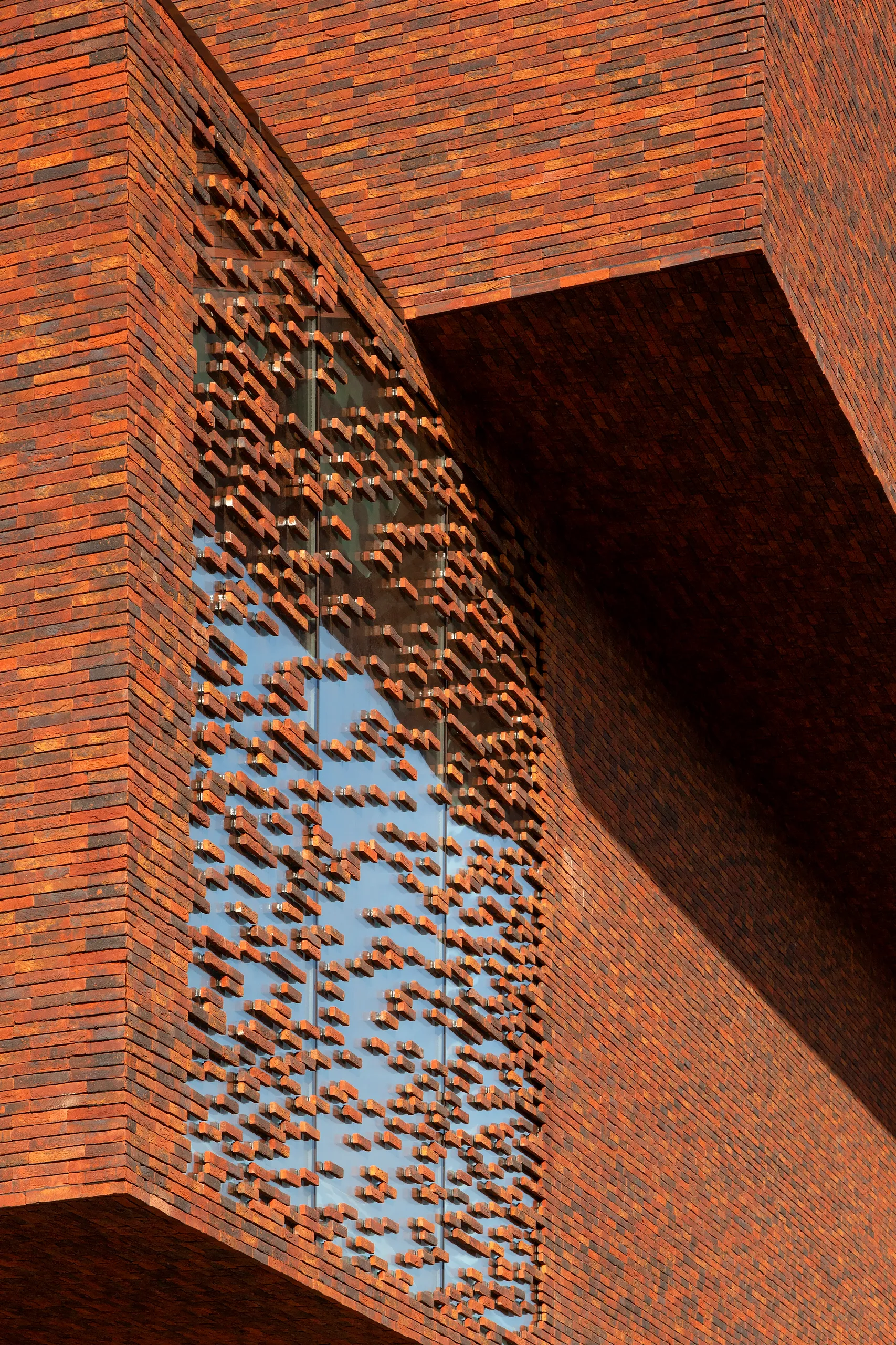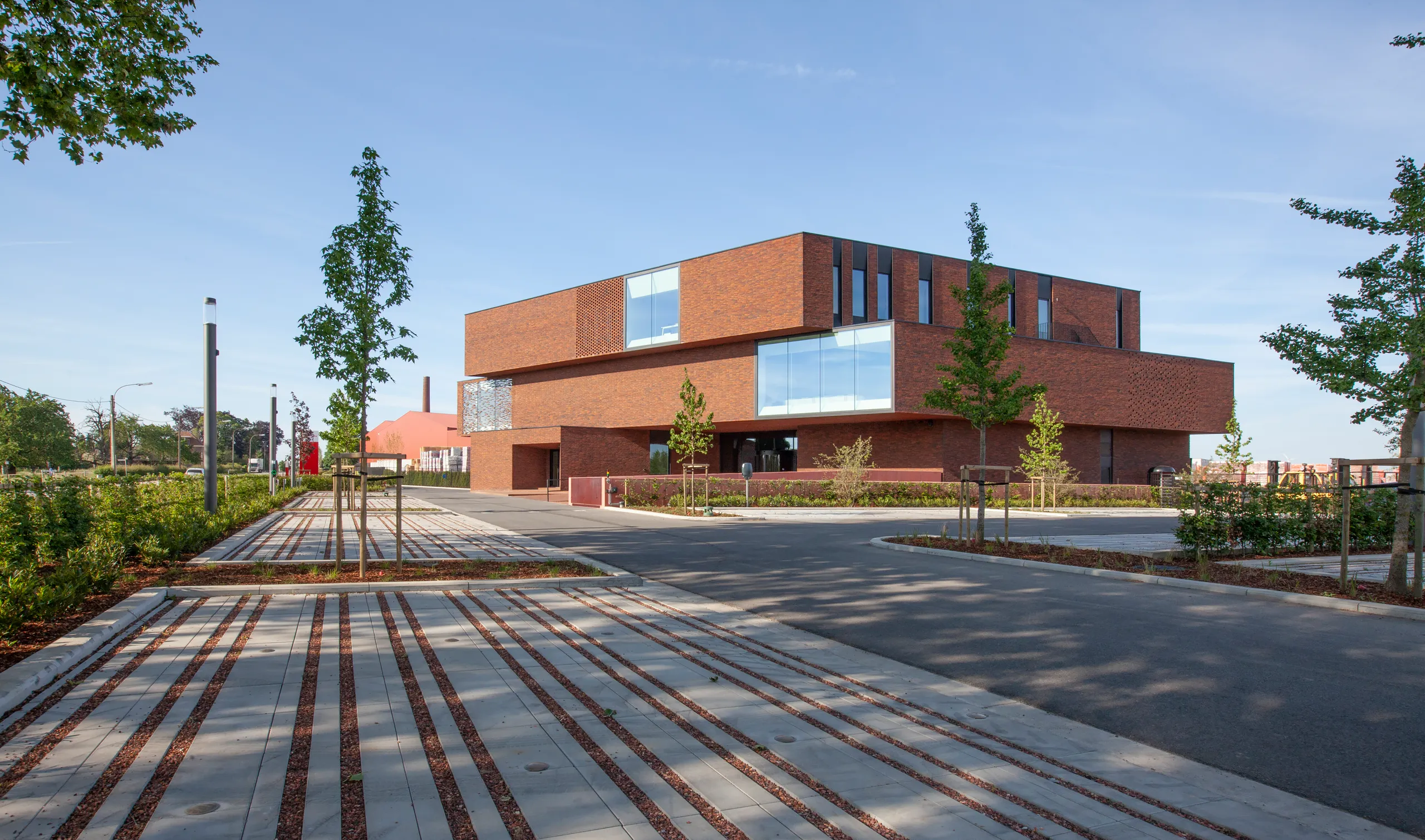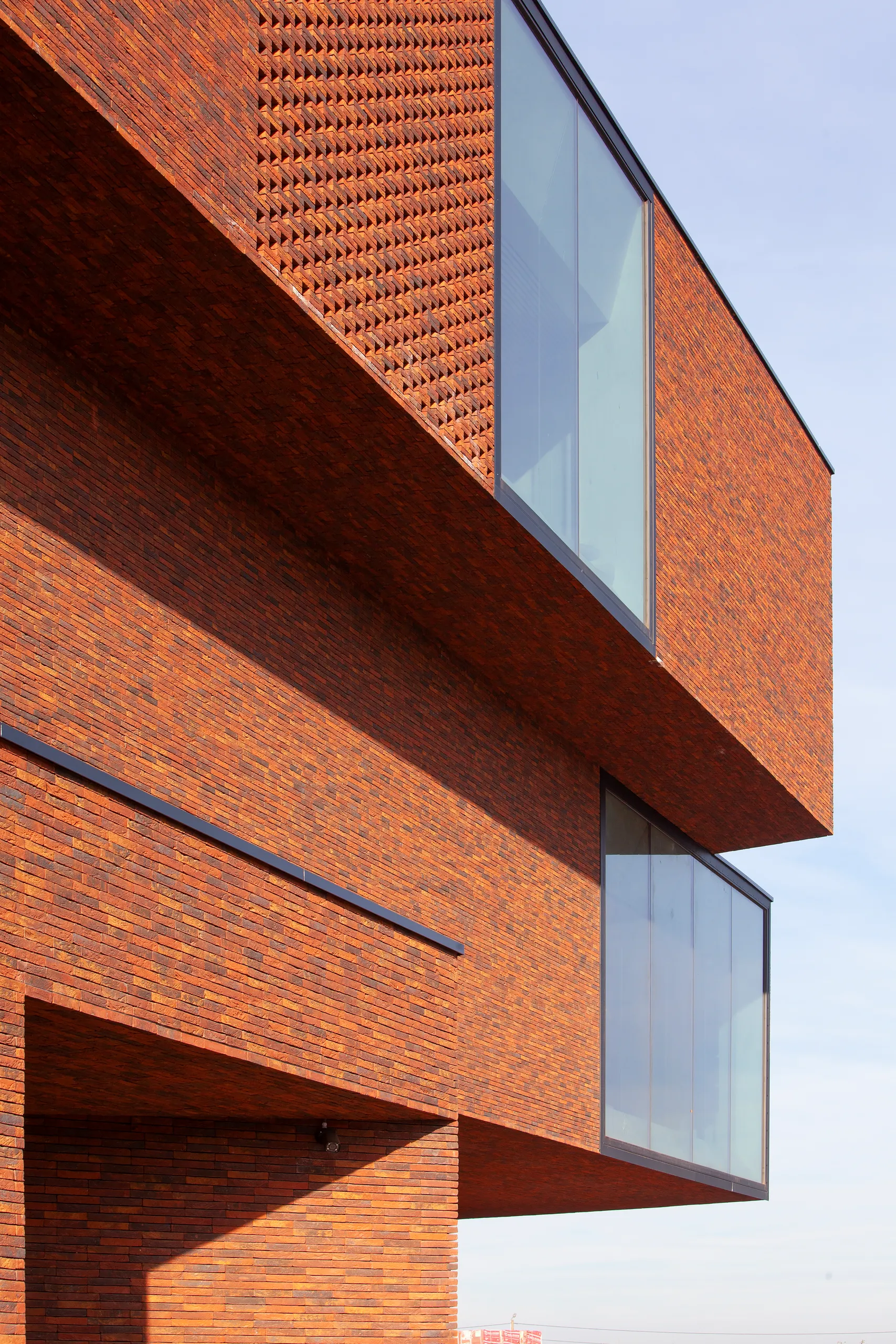 The new building’s ground floor, with its welcoming U-shape facing the street, houses the reception and administrative areas, symbolizing openness and accessibility. Above, the first floor’s parallelogram shape encircles an open space, guiding visitors through an immersive showroom tour around this central void. The top floor, mirroring the ground level’s U-shape, hosts more administrative spaces and overlooks the industrial site, blending indoor and outdoor environments seamlessly. This structure reflects Nelissen Bricks’ global presence, with interiors that celebrate bricks as both art and technology.