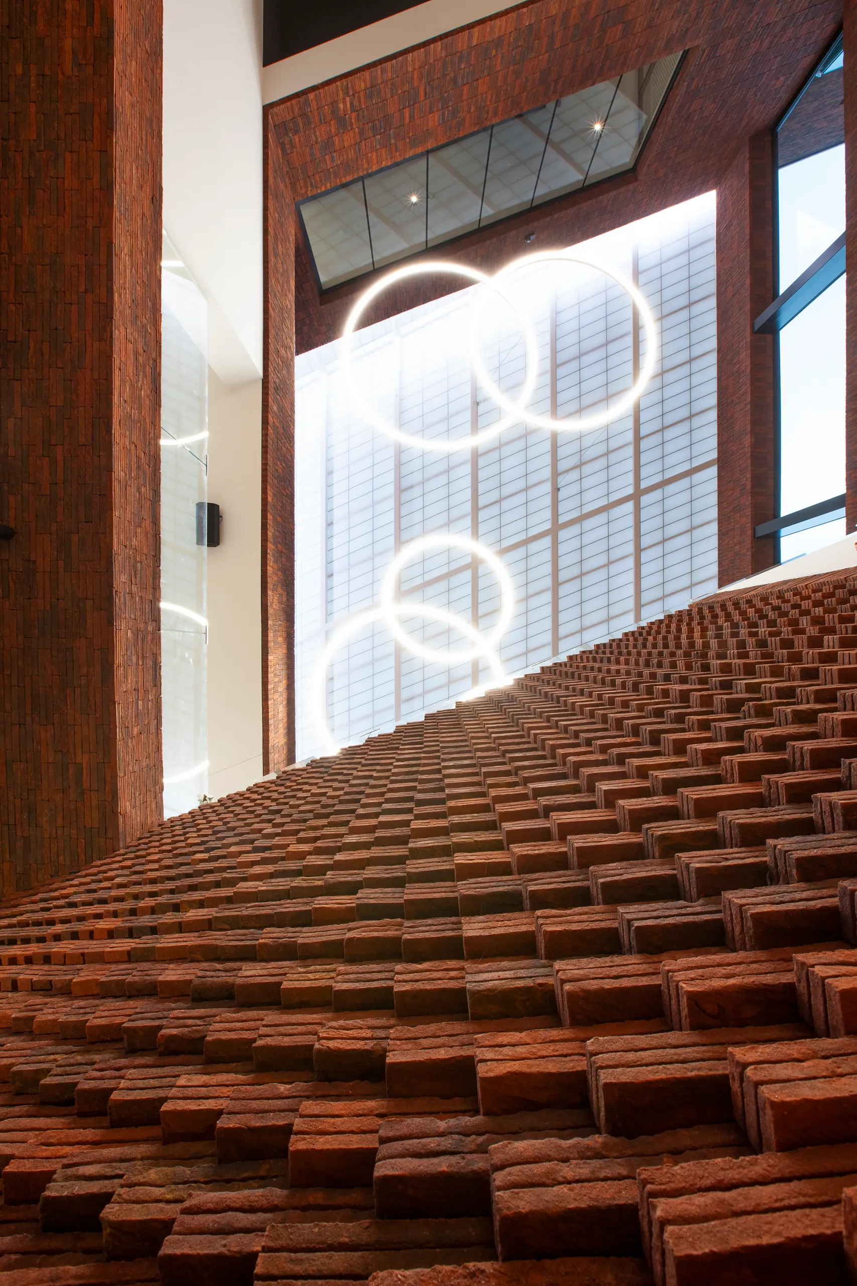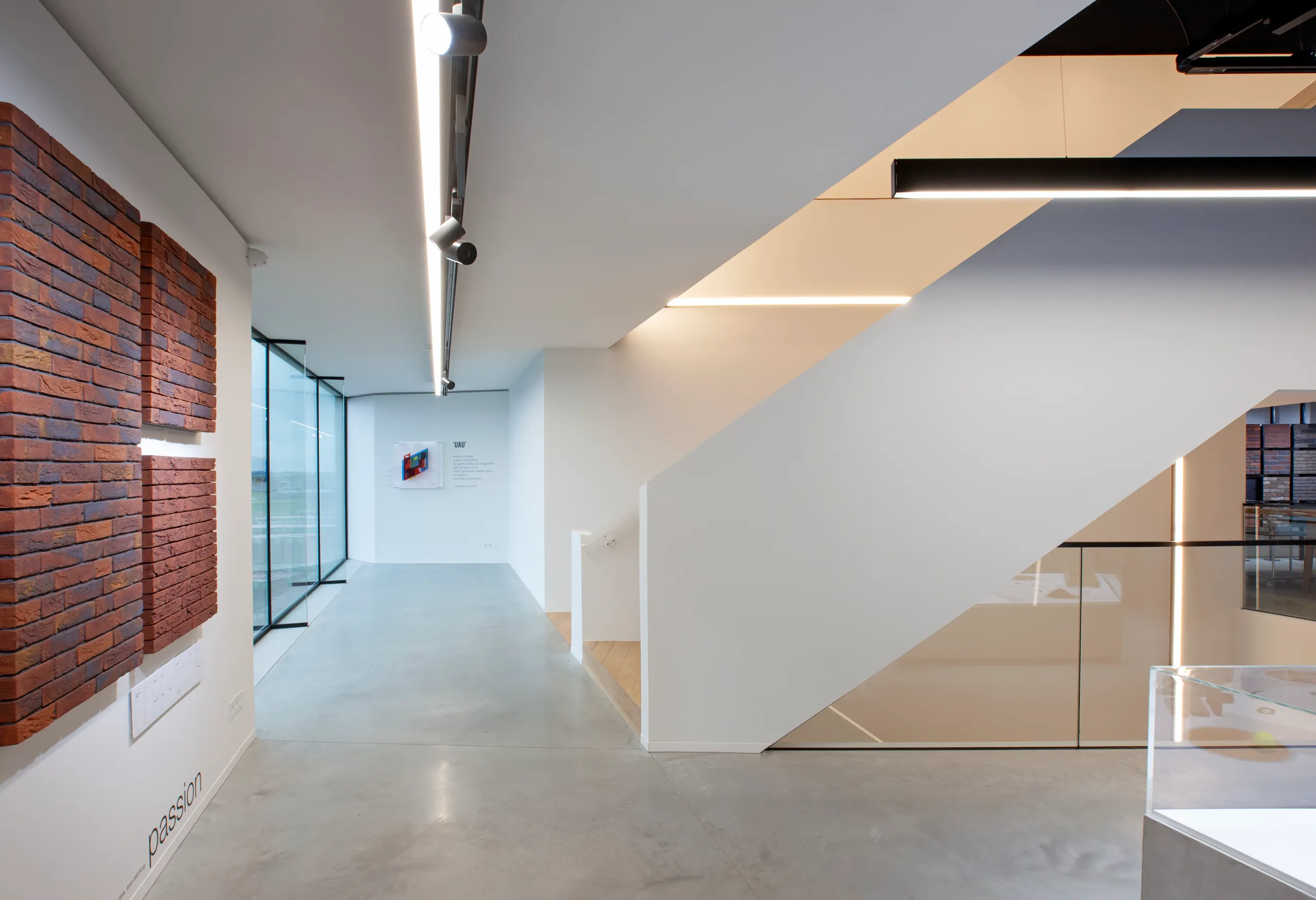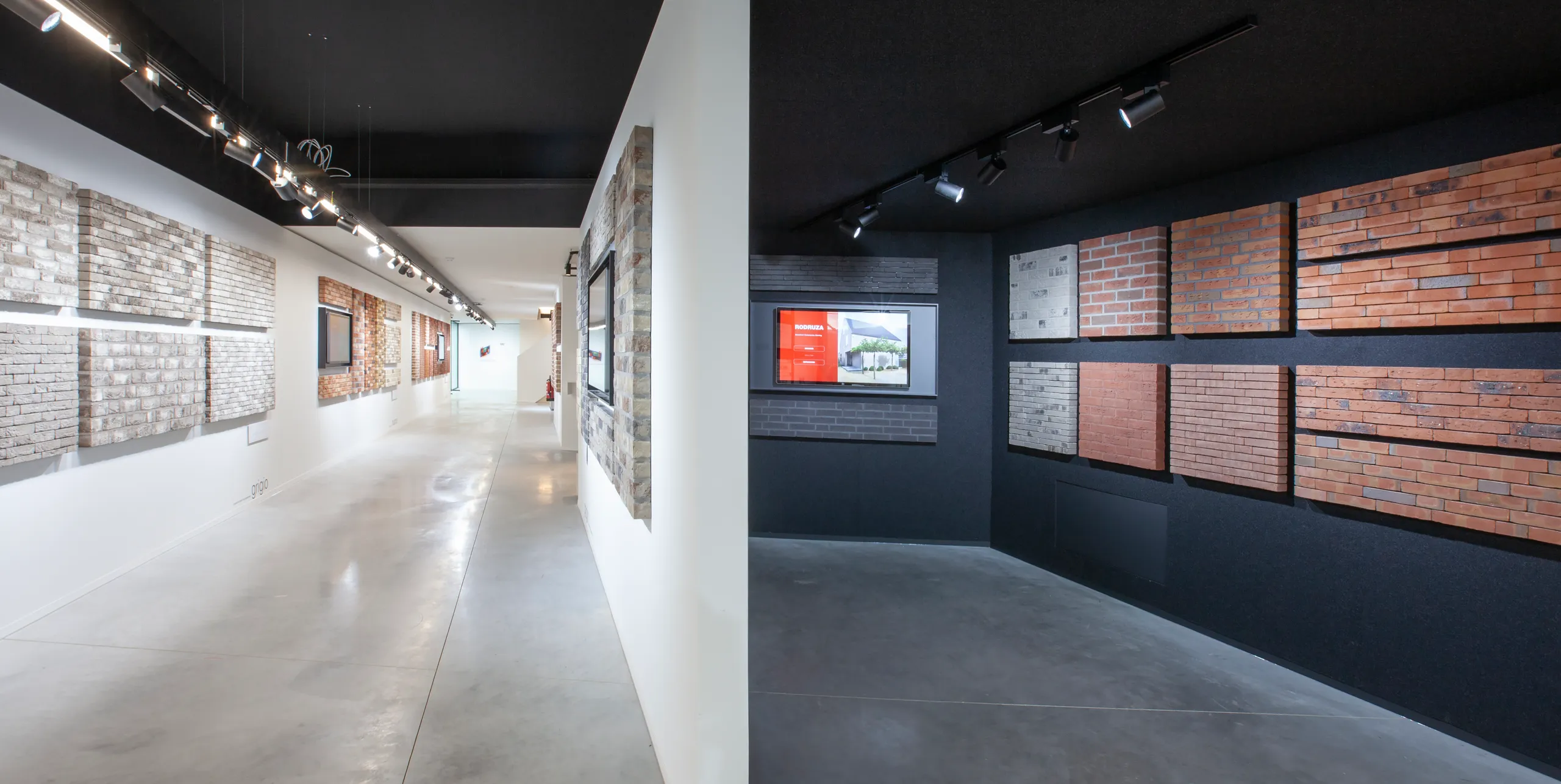 To streamline visitor flow, the ground floor includes multiple entrances and a welcoming reception area complete with a coffee corner. The first-floor showroom is curated like a museum, with versatile consultation spaces, a workshop area, and a central bar, all enriched by digital tools. An app and interactive touchscreens aid visitors in selecting and reviewing bricks, while the “Brickxperience” room offers a 180° screen for visualizing bricks in architectural models.