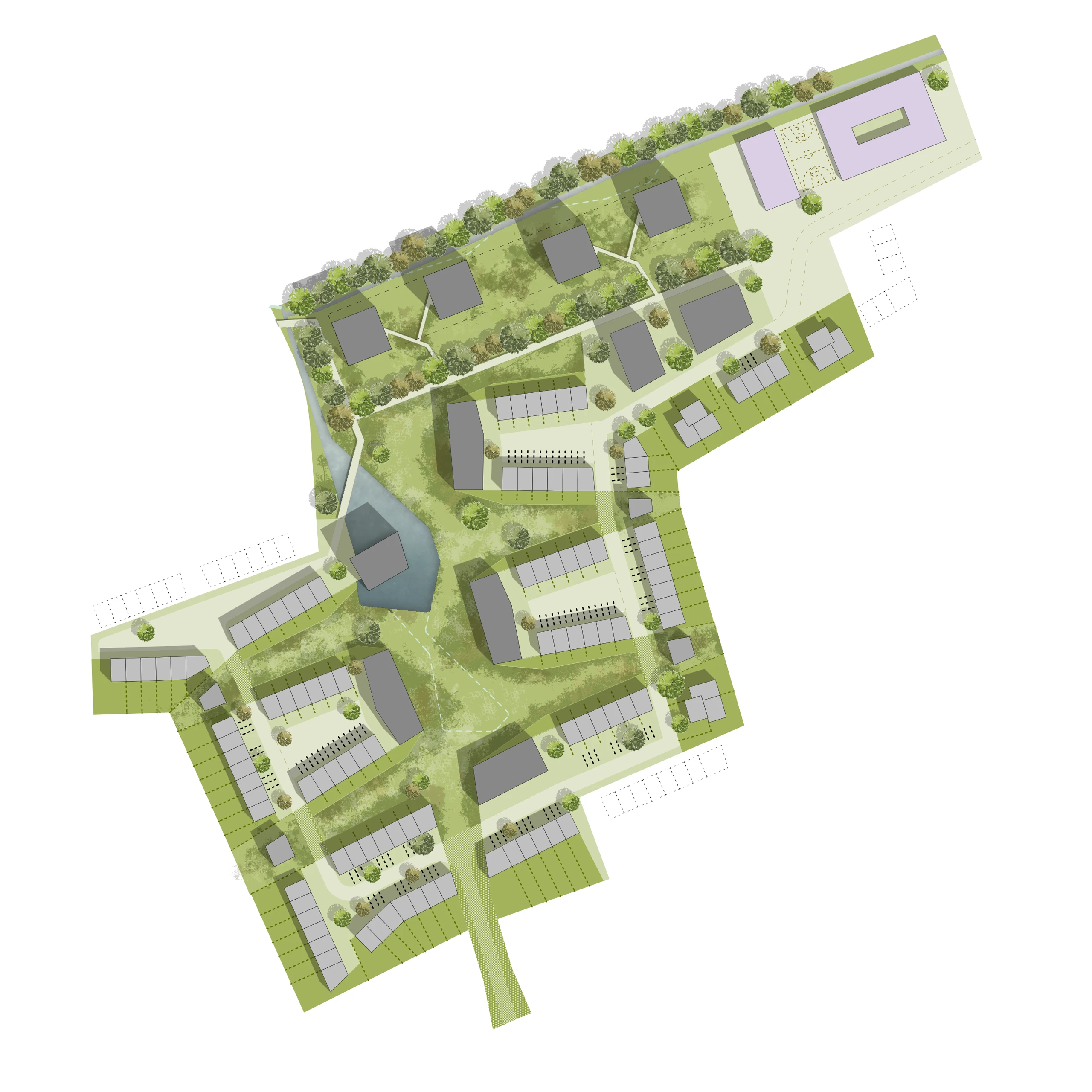Central to the design is the creation of a public green space that acts as a gathering place for the community and a natural water management basin. By enhancing the existing hydrology and integrating smart water management practices, such as the natural overflow of the Heilaak stream, the risk of flooding is reduced and rainwater is used to nourish the landscape.