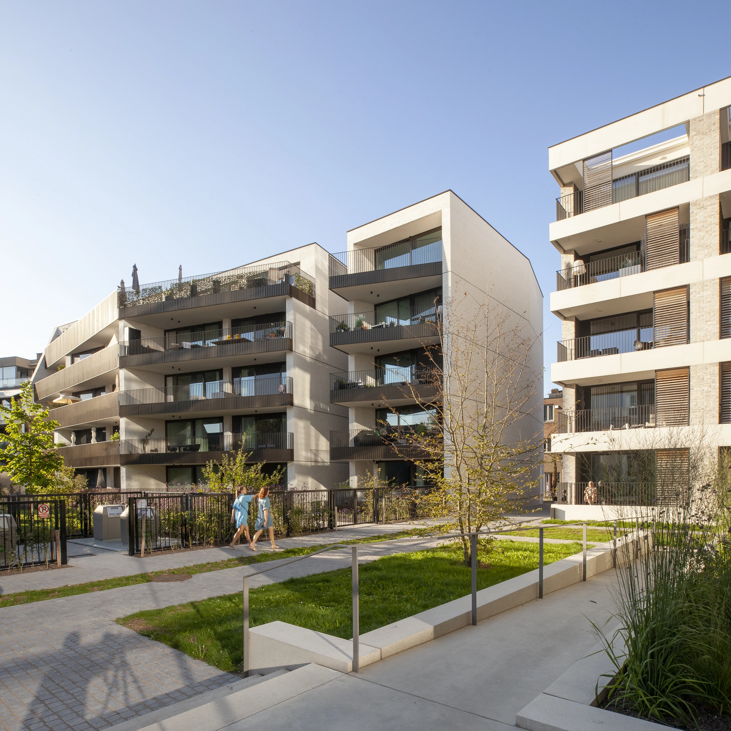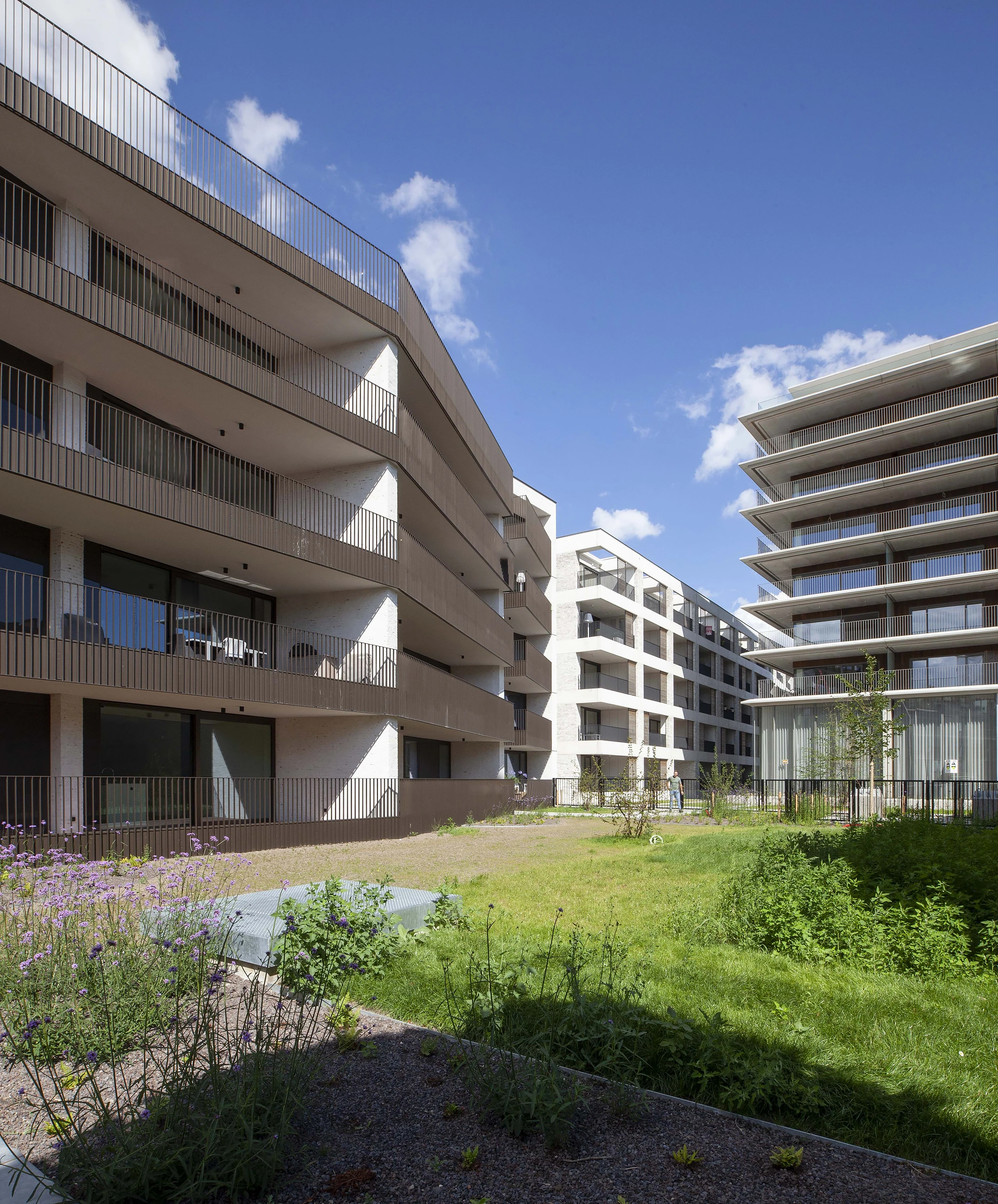 Finally, a very green, connecting, and car-free inner square (LAND Landscape Architects) was created as a safe play environment for children from the surrounding homes and a tranquil oasis where residents, visitors, and passers-by can relax.