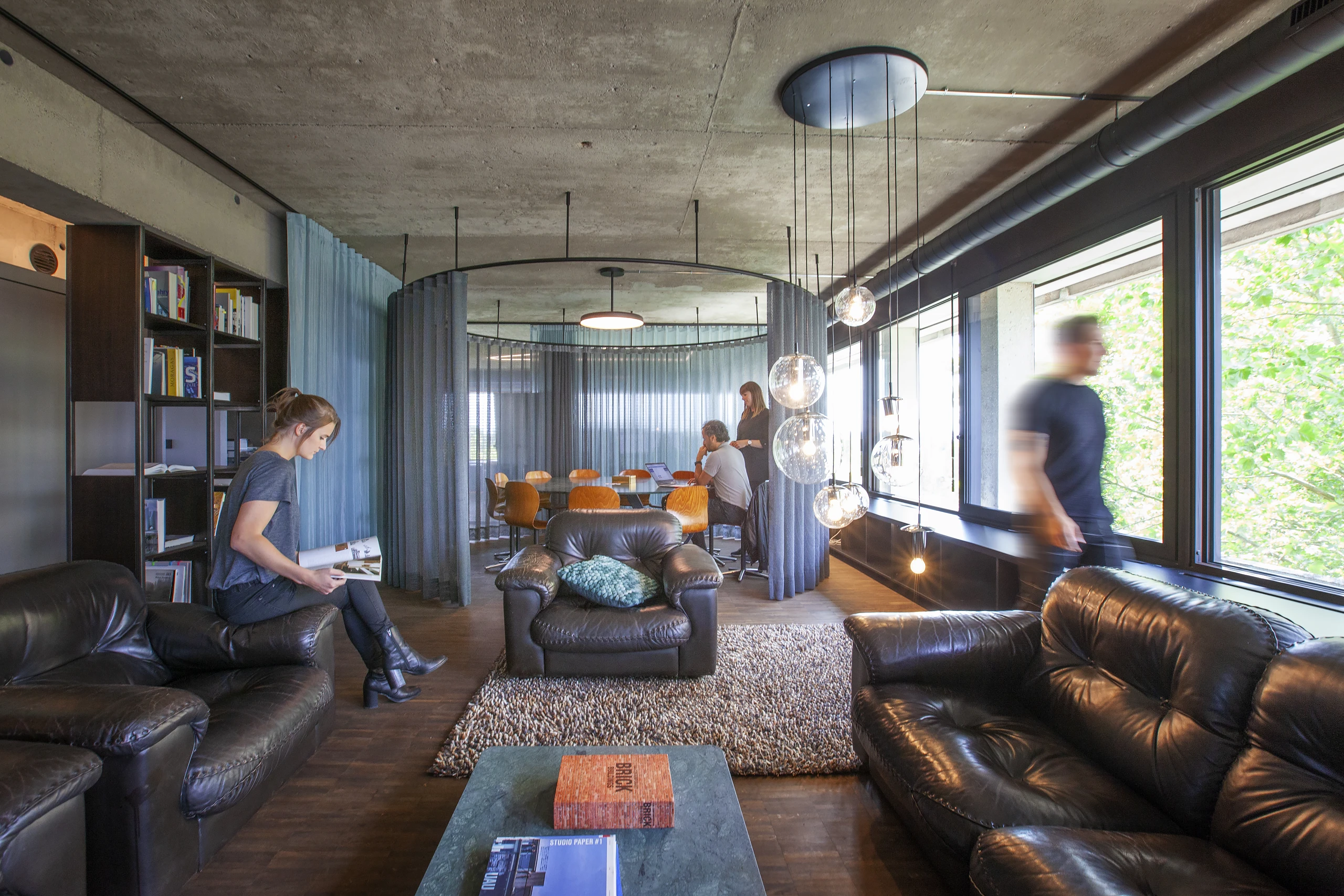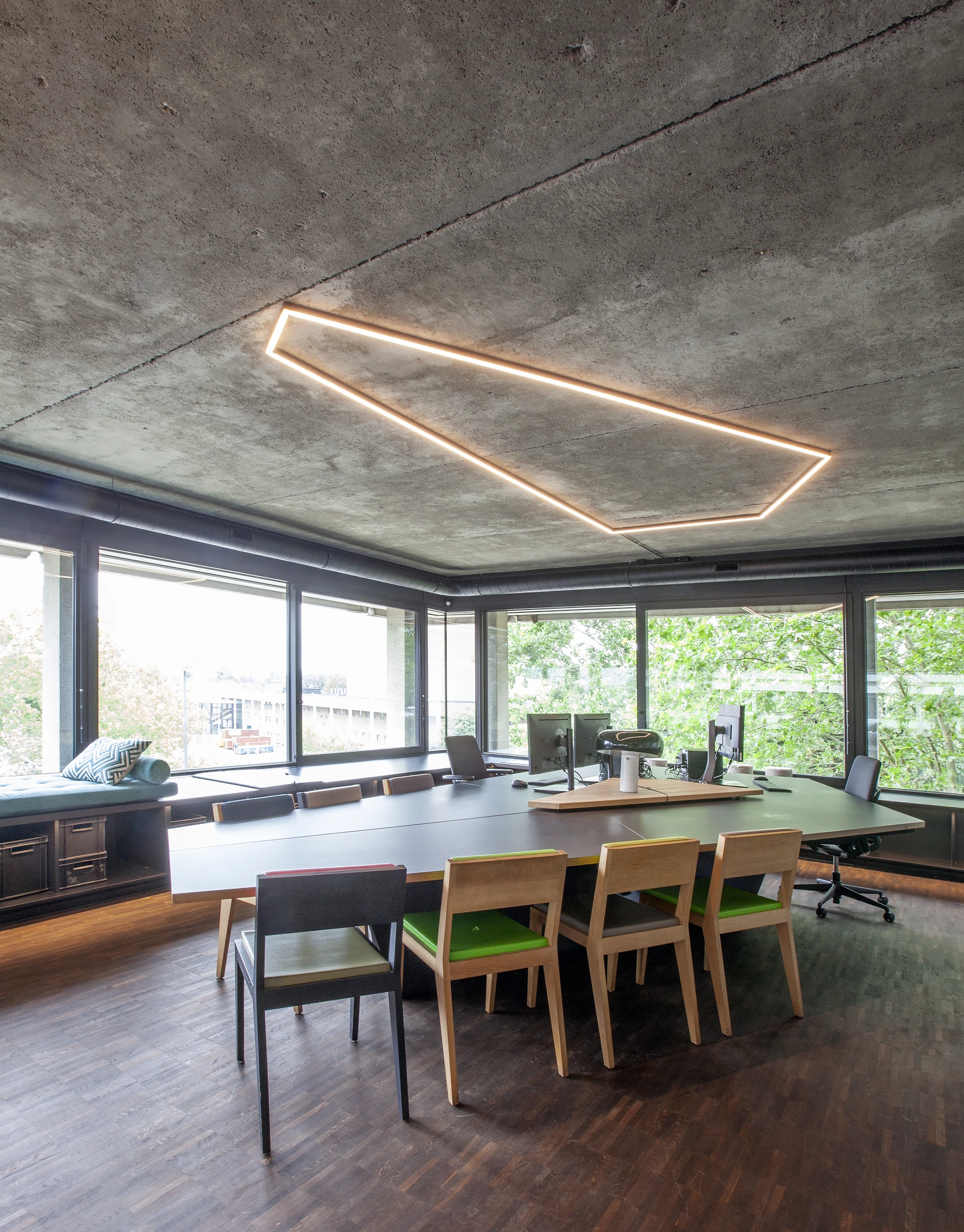 The central kitchenette close to the circulation core is the ideal meeting place for a quick consultation. In addition to a meeting room, printing room, and materials library, a consultation box has also been installed near the circulation zone. This is very popular among employees, especially for internal consultation.