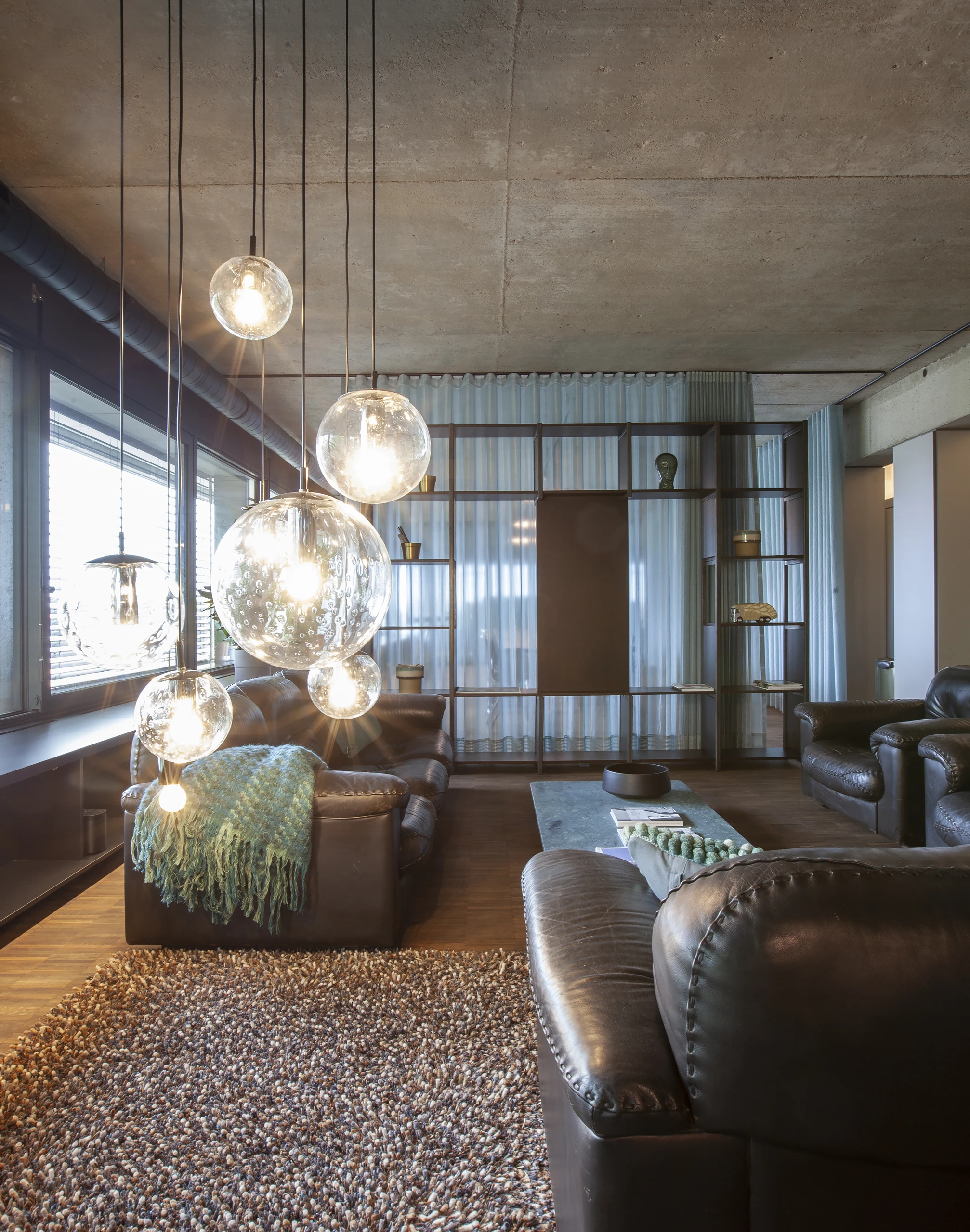 The modernist character of the building is further respected by the sober use of materials. The space under the window openings is suitable for storing samples and files but also serves as a bench. The separate furniture of the open-plan offices is sober and practical, while furniture with a story was sought for the consultation areas. The tables with leather tops and glass discs as a base in the middle zone found their first home in a Dutch library. The chairs were also stocked up in Brussels antique shops and contributed to the character of the desk.
