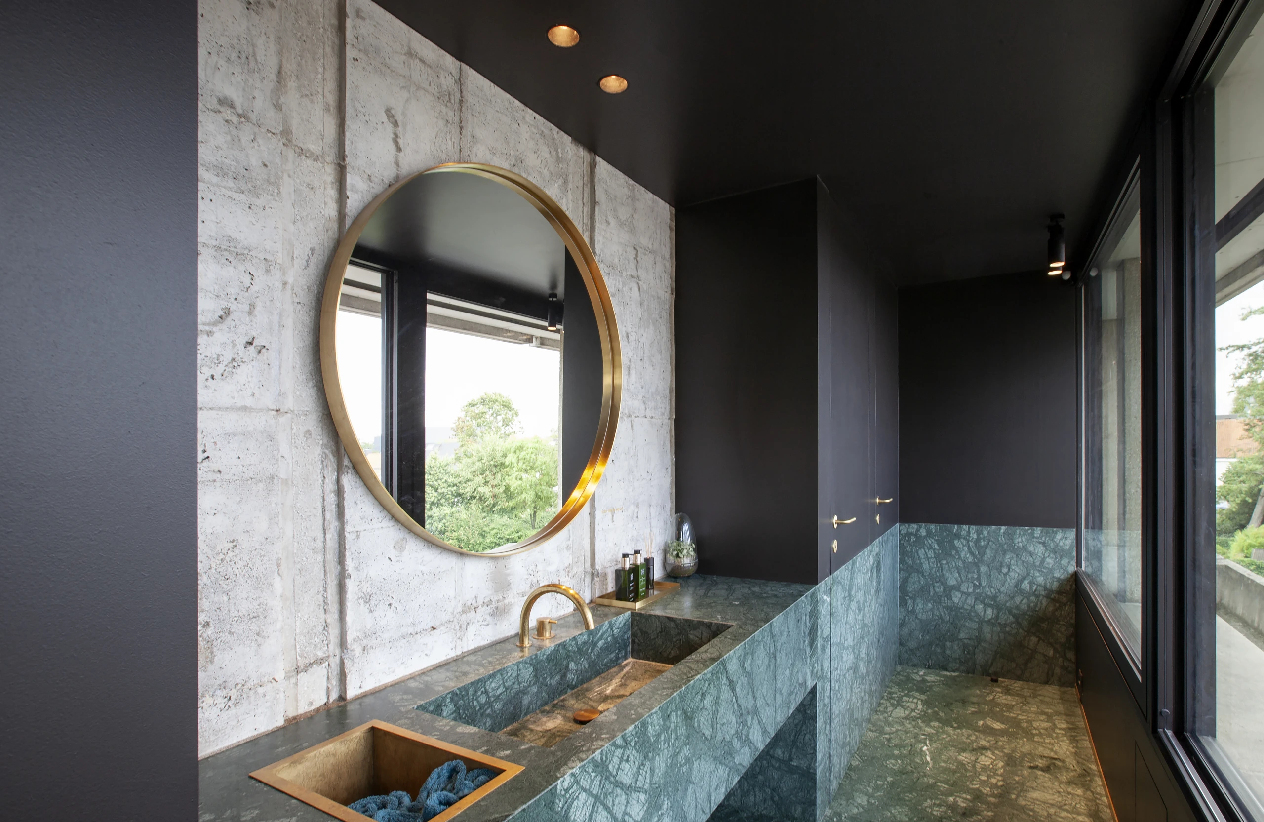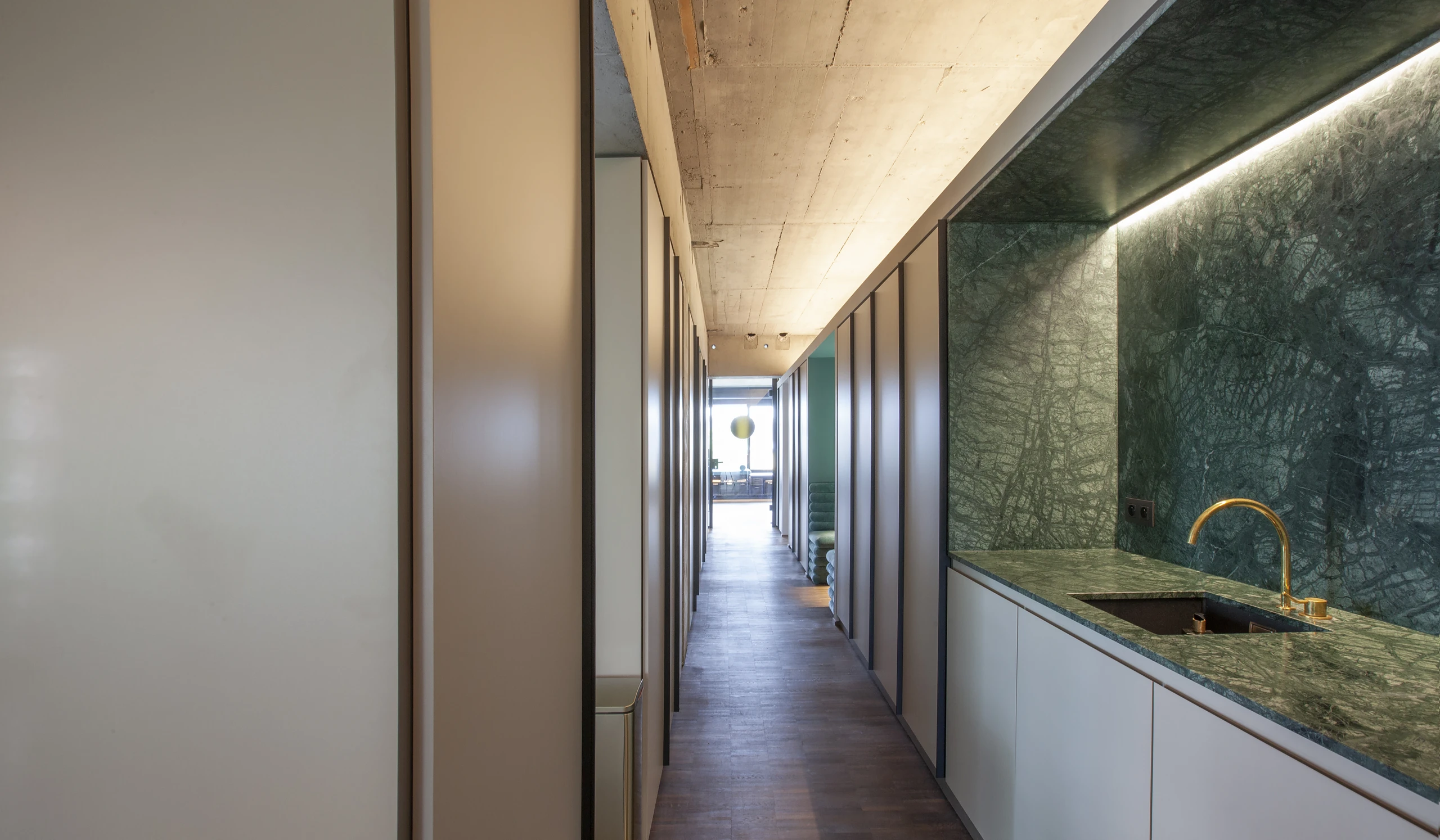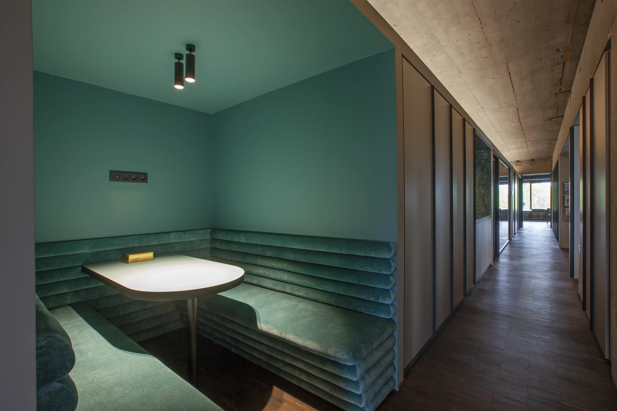 The divisibility of the central zone is ensured by the acoustic curtains, which also create a warm feeling due to the fresh green color. The pleasant greenery returns in the natural stone elements of the kitchenette and bathroom, complemented by details in gold.